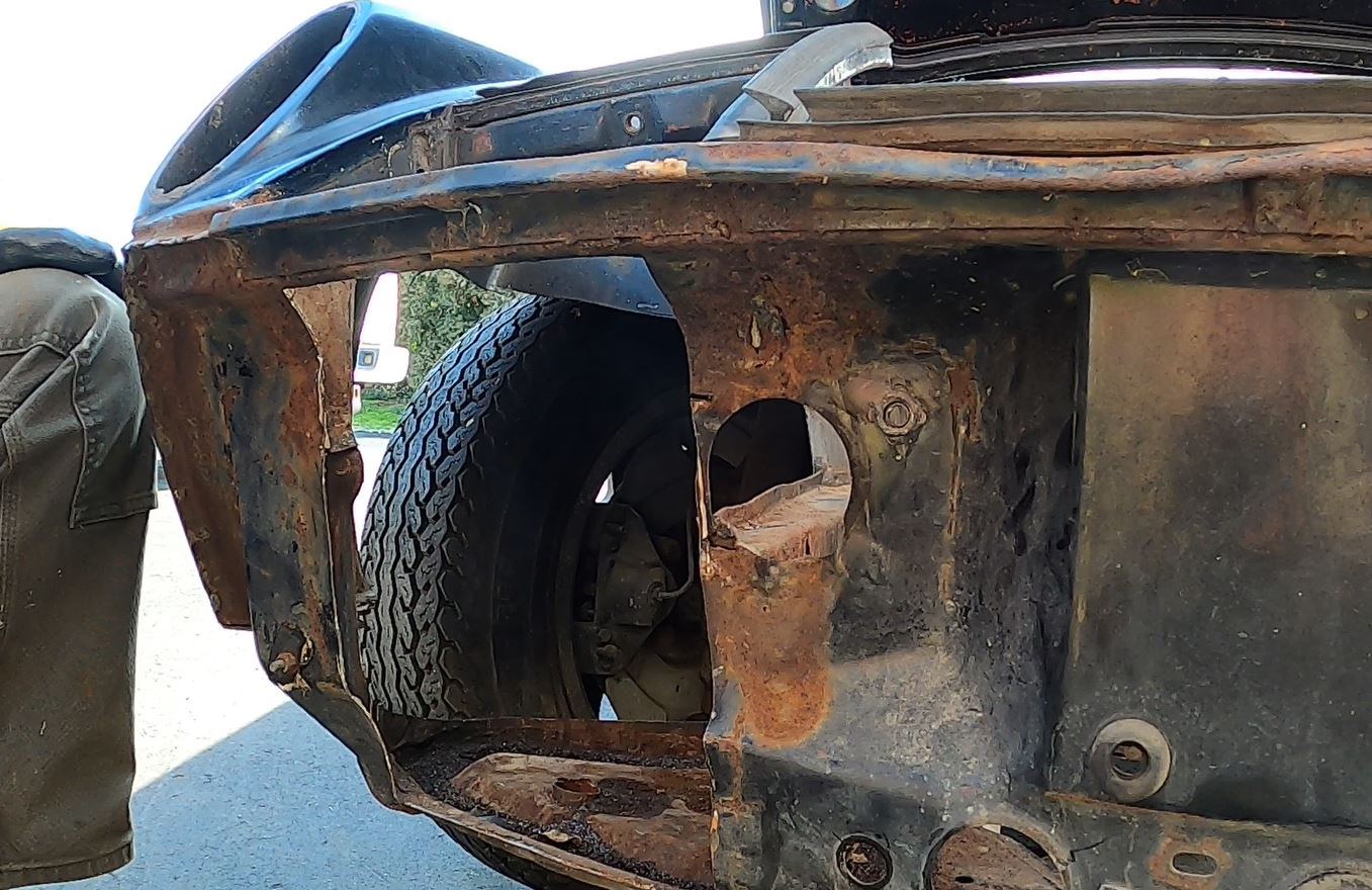 First step is a proof of concept. I decided to use a corner of the black donor chassis and started cutting. A few important points: - I want to keep the pop-up look so no "lights in the turn signal buckets". I found a set of DOT legal hi/low LED lights that use 60mm beams in a 90 mm mount system. The plan is to mount them to the rear wall of what's left of the headlight bucket. - this is a '75 BUB chassis but you can see that this approach preserves the area needed for the bumper mounts. - looks like plenty of depth for a radiator and fan set up. - the turn signal bucket is totally out of the way. - depending of final available space, it looks like I can get maybe a 12x14 radiator in there. The Renegade radiator in my LS car is 27" x 14" (378 sq. in.) Let's go with worst case: I can only get two, 10"x12" or 240 sq. in. in there. I can get 5"x24" in the center for a total of 360 sq. in. So even worst case looks like it can work. I'm enouraged! Now to find some radiators... 996 turbo radiators? |