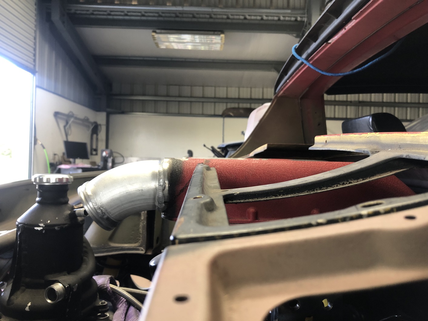 Waiting for the custom length shift cables so started rethinking the intake set up. I think I want to drop the whole thing so it fits under the stock sheet metal. Here it is dropped 1.5". Not quite enough. Looks like maybe 2.25" may do it.