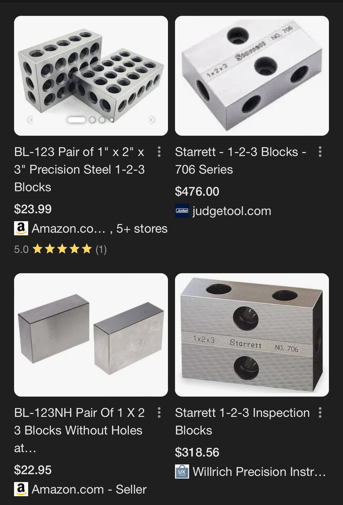 I’m gonna take all that to mean those blocks ARE more expensive than the manifold lol… (IMG:style_emoticons/default/happy11.gif) All depends . . . China made or Starrett (IMG:style_emoticons/default/drooley.gif) or maybe Brown & Sharpe? |