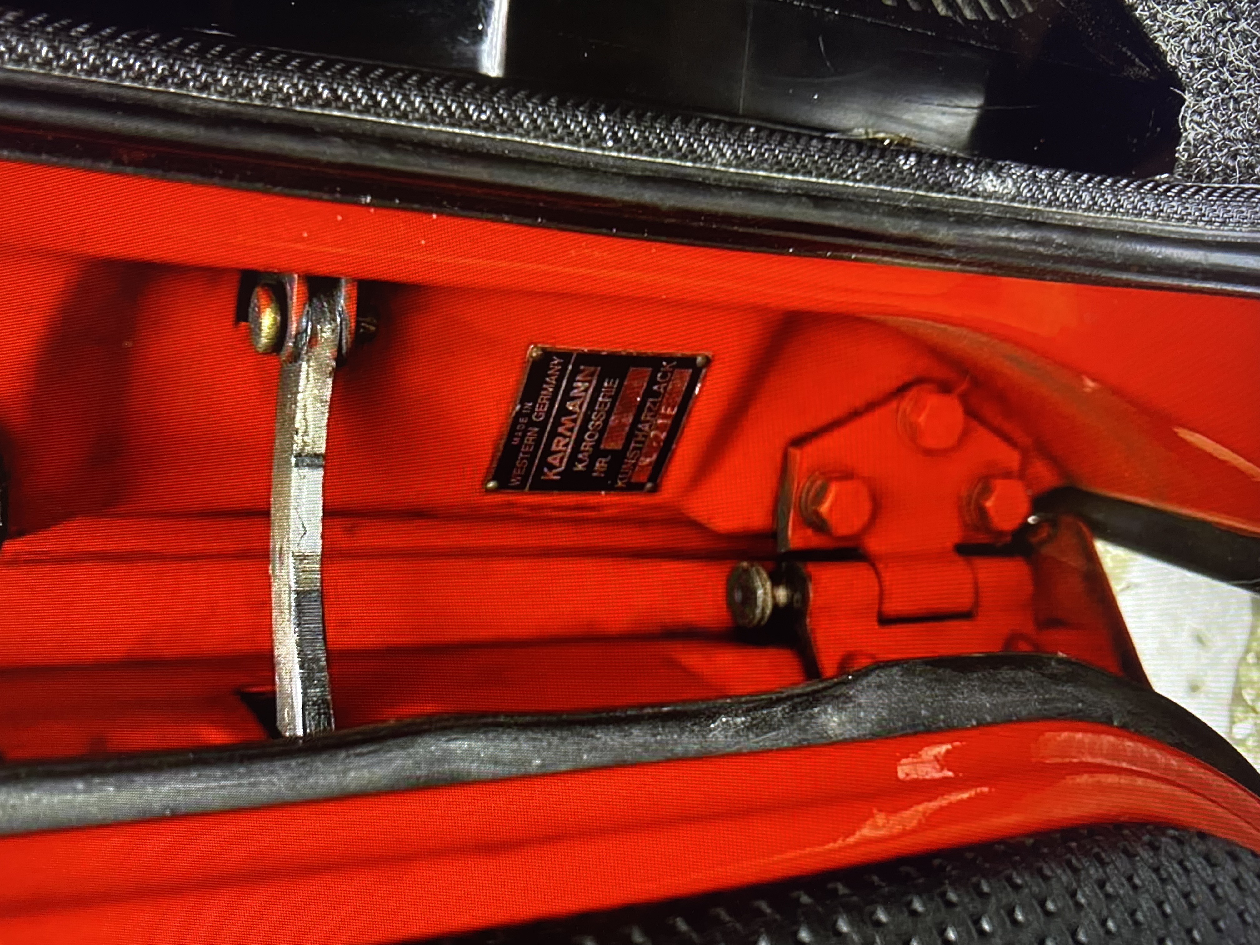 Wonder what a comparison to other Karmann cars (Gaia, 411/412?) might reveal. At this point I’ll go with mine have been replaced somewhere along the line but I didn’t pay attention. Will clean/prime/paint them. Ghias are hard to compare. here is one that looks original. different kind of hinge. definitely paint the fixing bolts. hard to see what goes on with hinge pin. 411s and 412s were made at main VW plants - not a karmann product. |