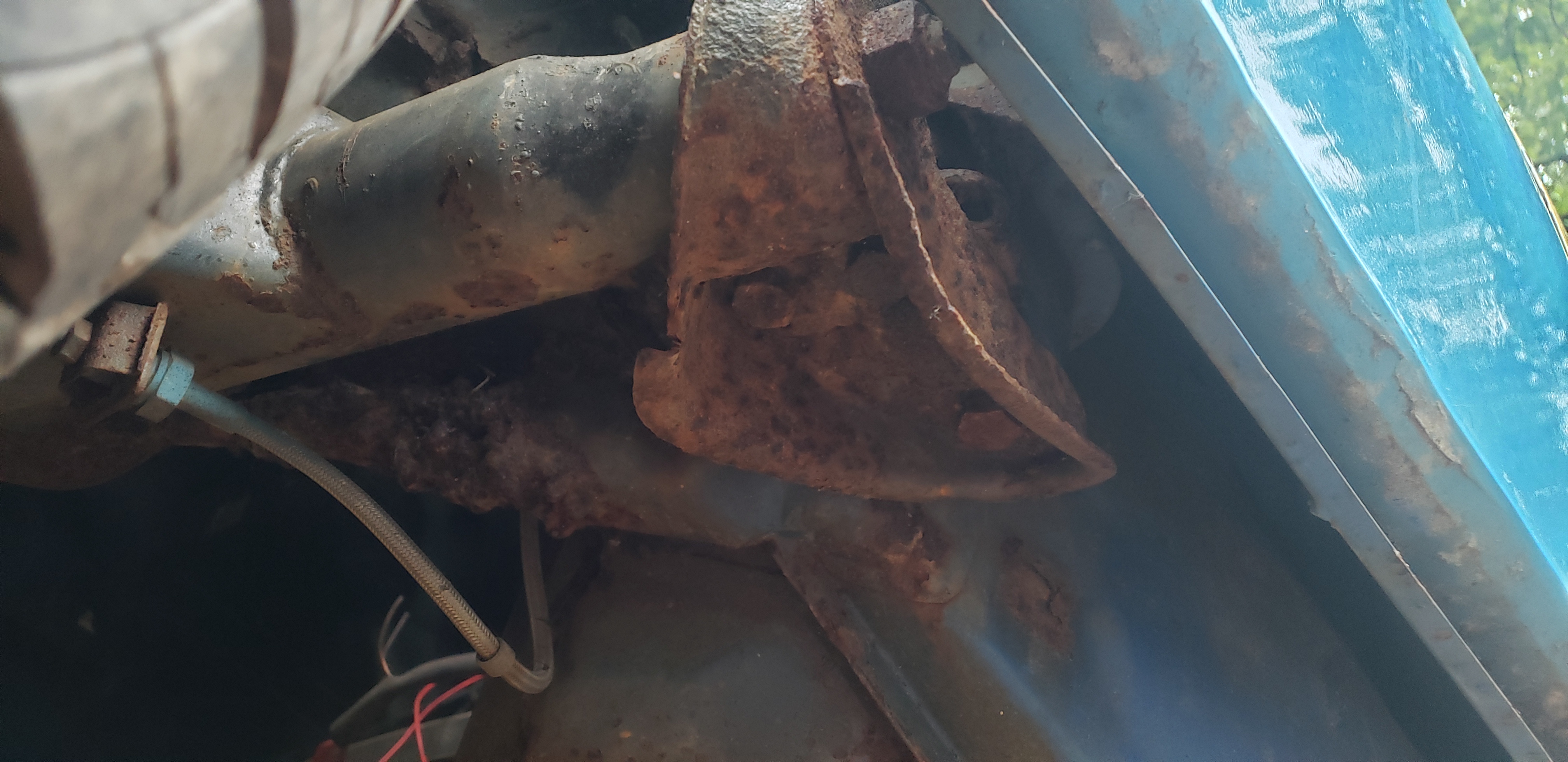I made some progress today. Removed front and rear suspension. Im not discouraged like I was yesterday. The inner console definitely will be replaced. I think I can get away with welding g the outer in place. Overall it seems pretty solid. There is a nickel size hole that doesn't go all the way through and is solid surrounding it. I think I can fill it all in and grind it smooth. Here is a picture of what I'm looking at. The bug gaping hole will be partially replaced by the new inner console and the rest I will cut back and weld in a plate. Thoughts?? Exactly where mine rusted away. |