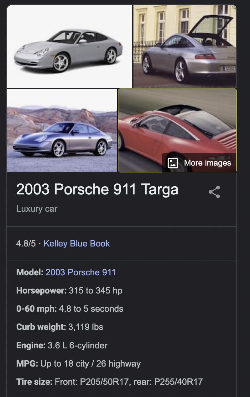 2003 996 Targa 6sp 67k miles Aerokit Gt3 wheels Porsche Sport Exhaust ~$35k Looking for a ‘turn key’ 914 of similar value. Or Add $ for something special. Hmm, maybe. Not sure if mine would hit that mark or not. Would be close. What do you have? |