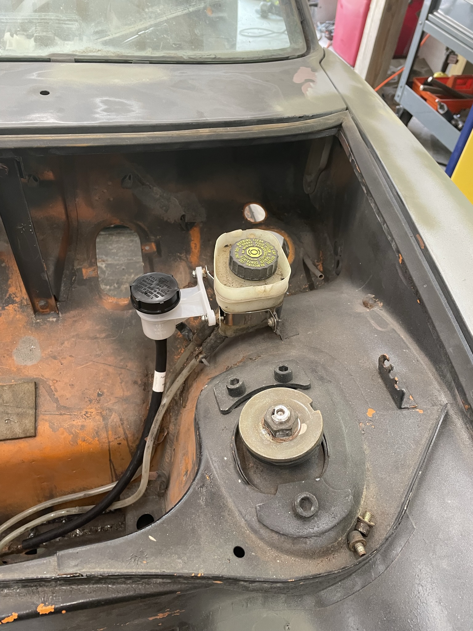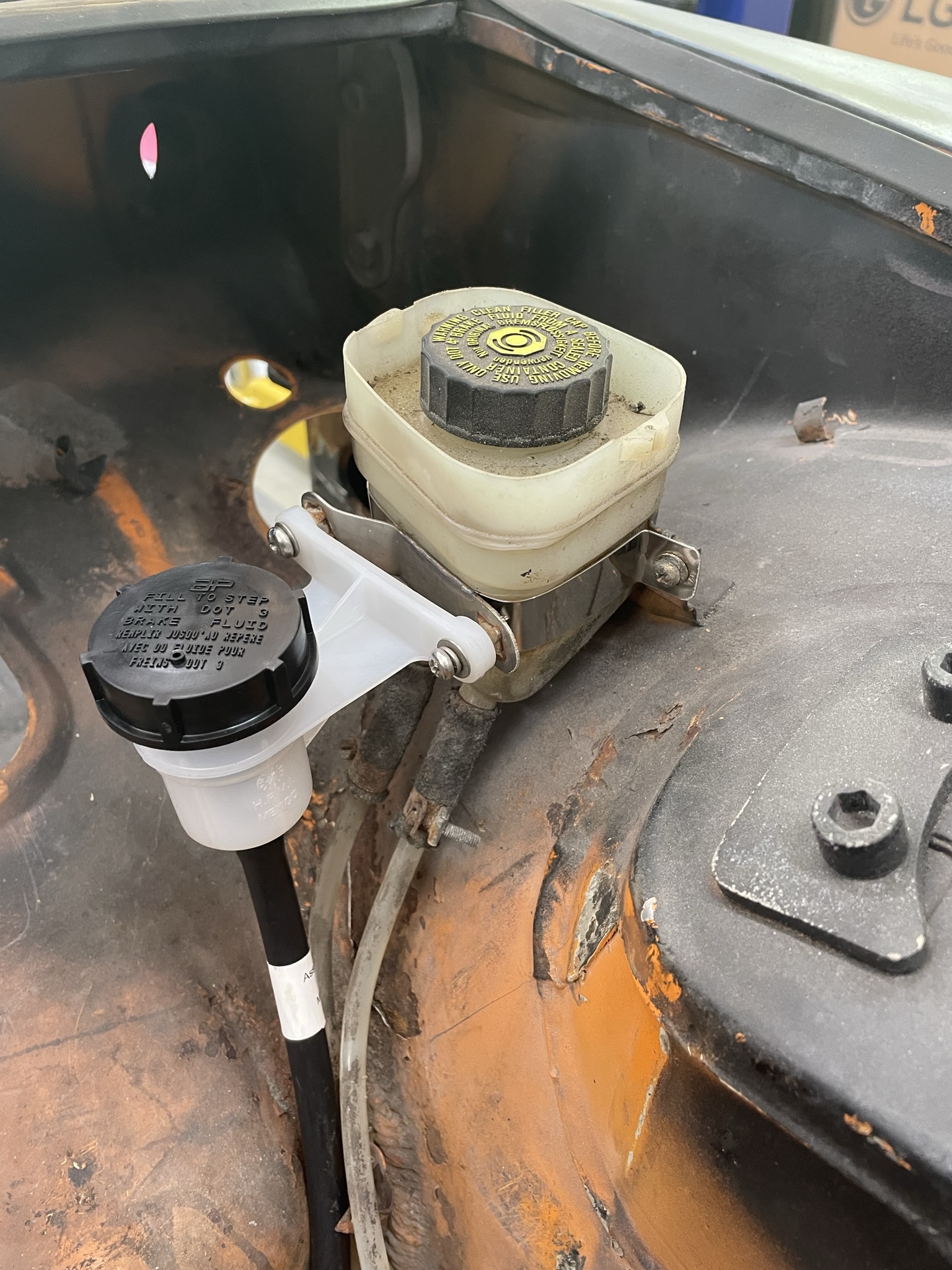 Some simple little updates today. Since I’m going with a hydraulic clutch I needed a place for a reservoir. The original bracket for my brake reservoir was a rusty POS, so I made a new stainless bracket. Then I fab’d a bracket for the clutch reservoir and welded them together……a small simple project with good results.