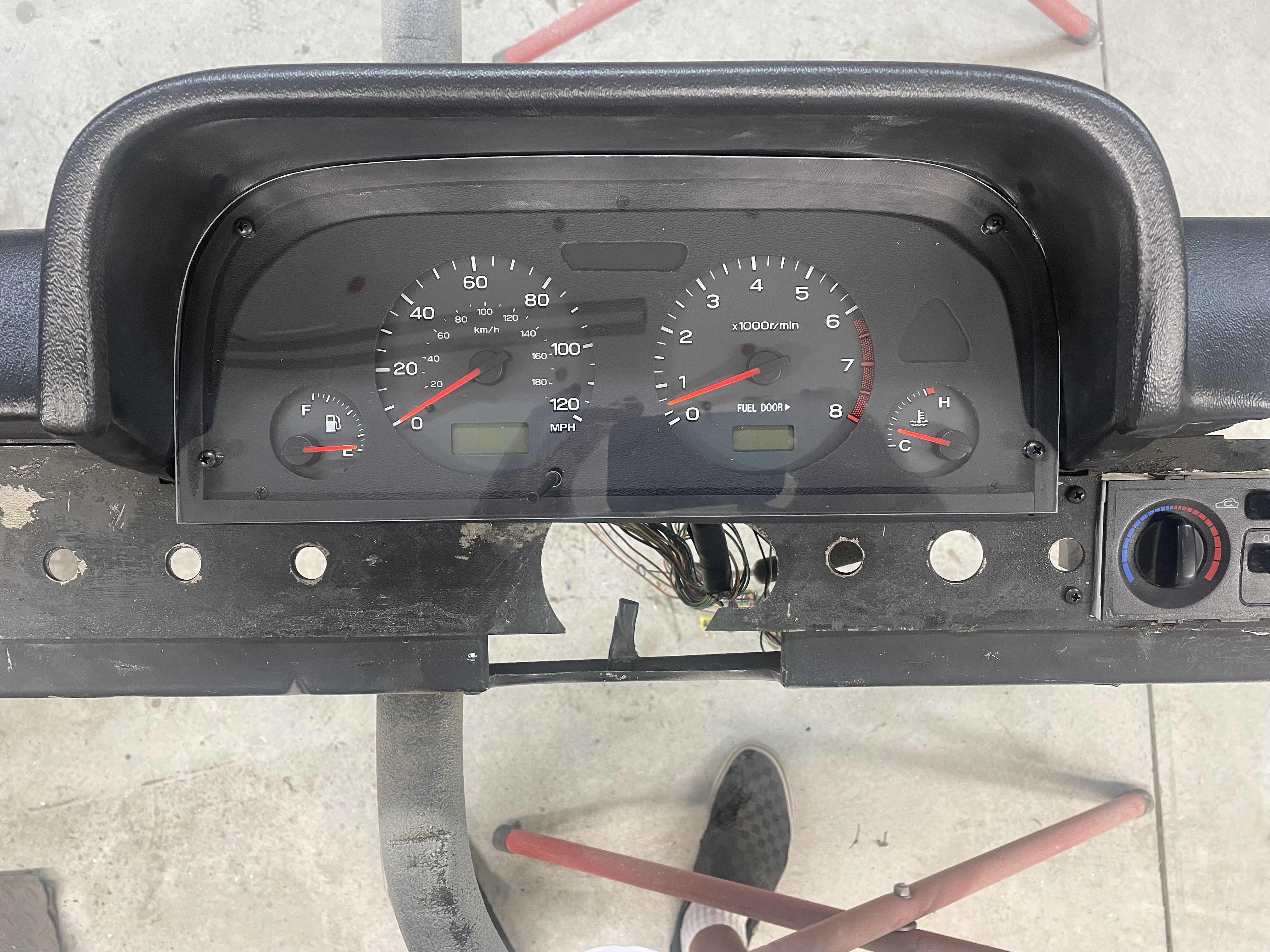 Hard to tell from the photos but I also removed the indicator “films” from the stock Suby faceplate and glued them behind the cuts above and to the right of the tach and Speedo. This will give me the indicator lights for turn signals, high beams, Alt, Oil, and check engine. They’re behind the little oval cutout and the guitar pick shaped cutout.