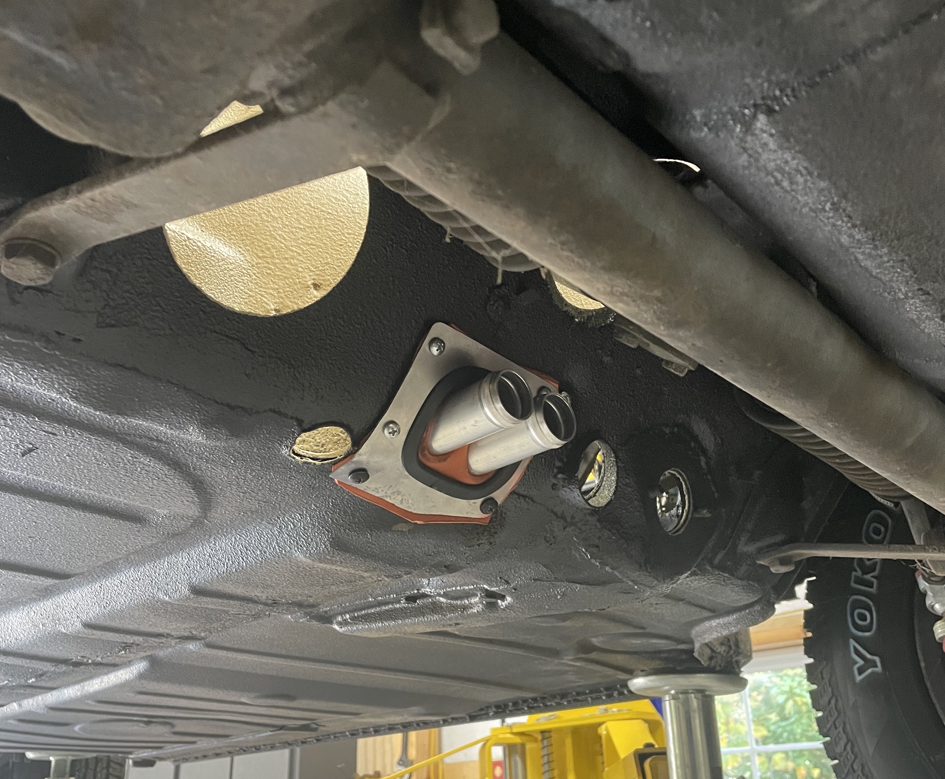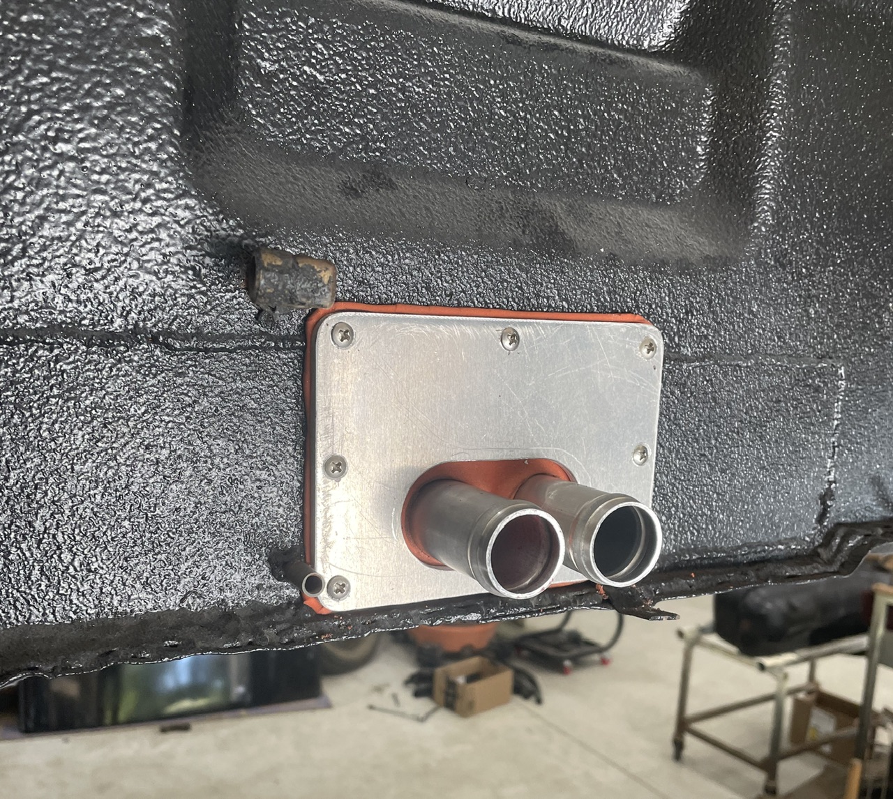 Put my cooling lines through the tunnel today. The lines are 1-1/4” aluminum with barbed ends. The tubes share an insulating layer of insulation to keep the heat out of the tunnel/interior. The tubes are sealed to the body at each end via 8mm high temp silicone seal with retaining plates.
