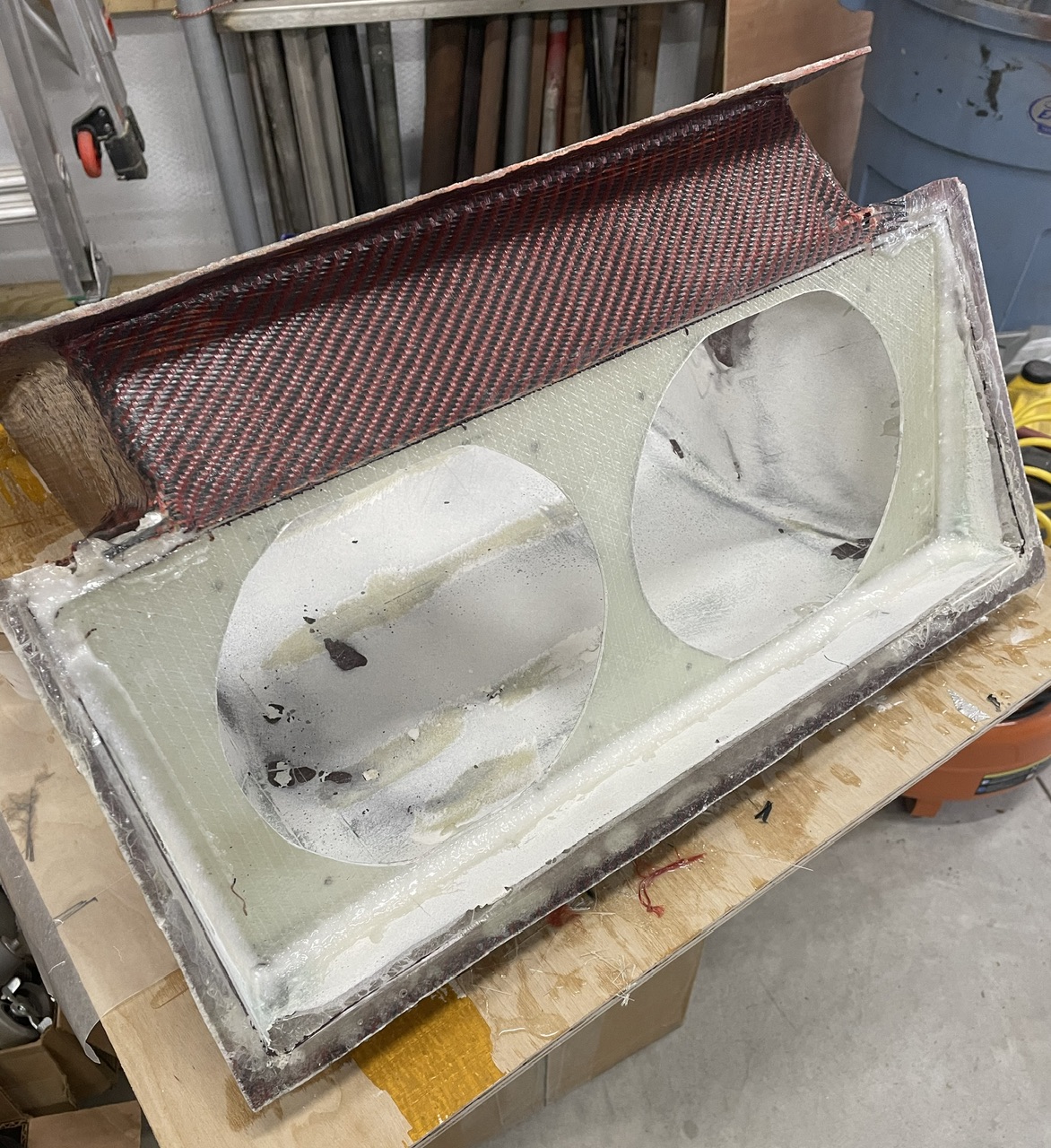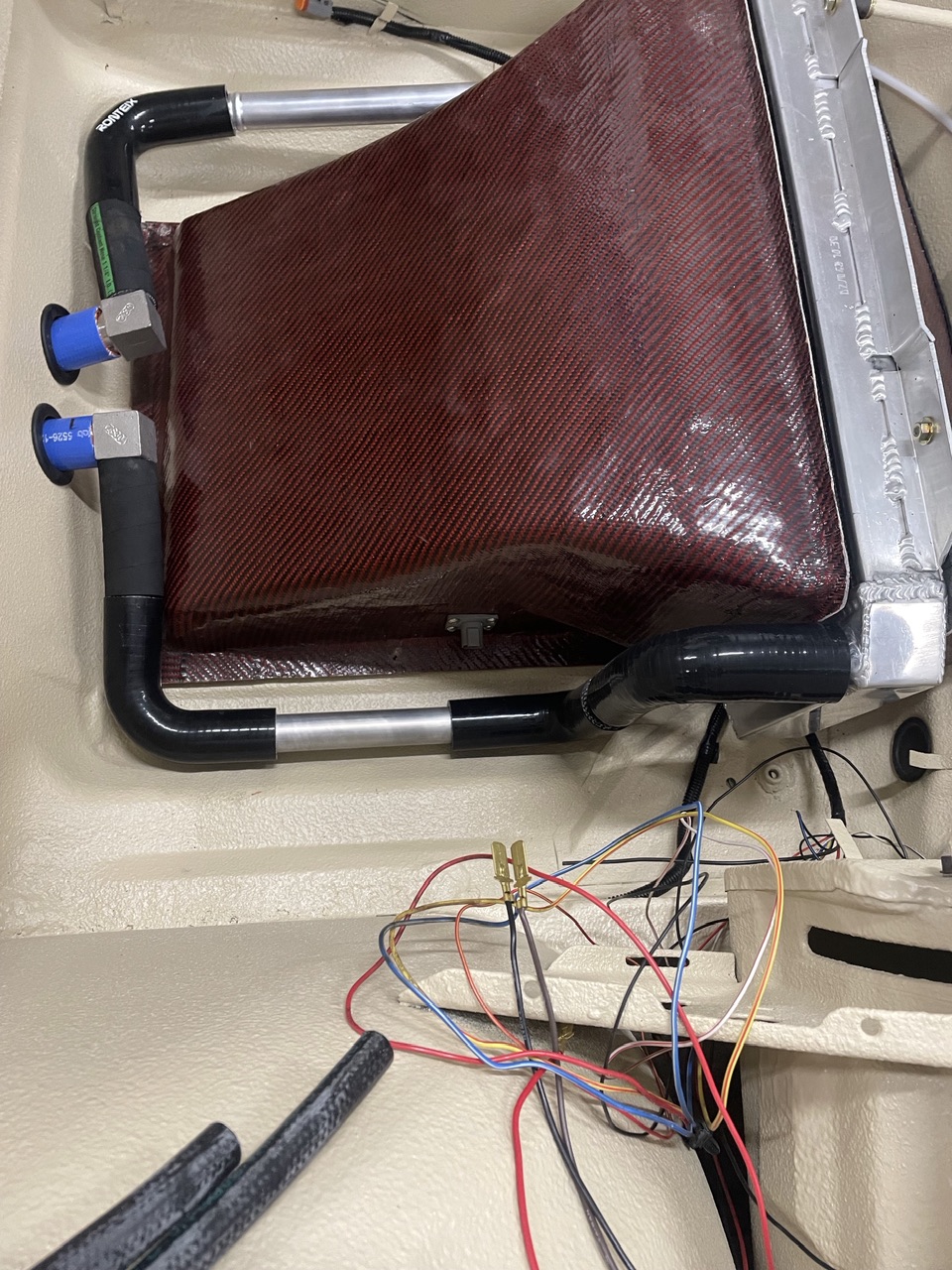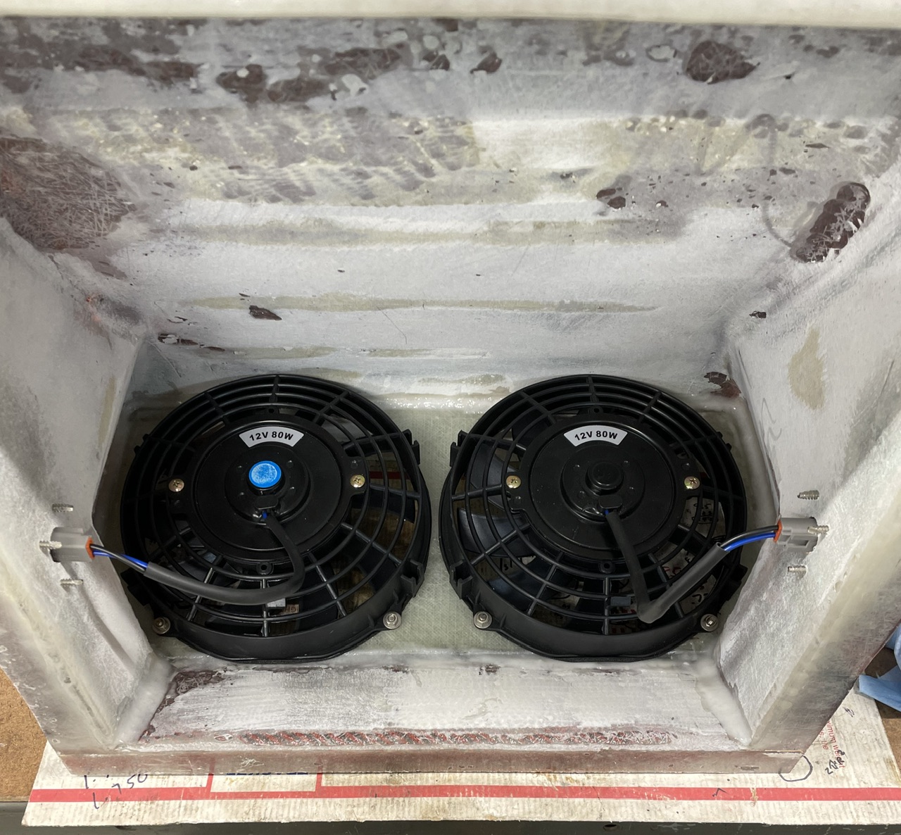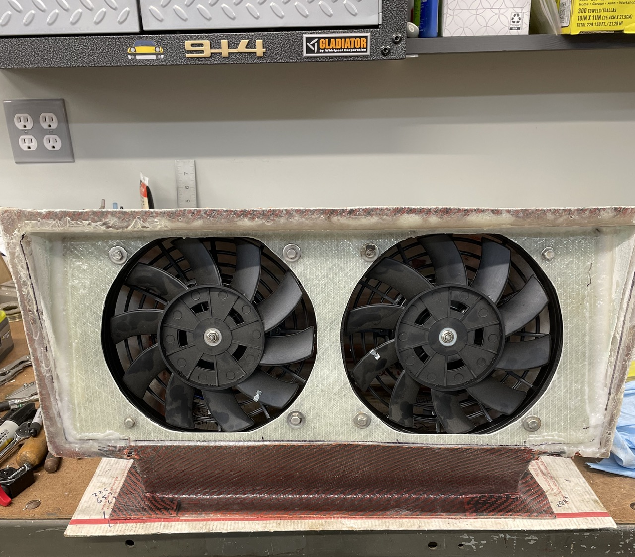 Working on finalizing the radiator install. I needed to mount my dual fans in the exit duct, so laid up a flat section of biaxial glass and cut the holes for the fans and outside dimensions. Then just bonded it in place with epoxy thickened with 404 and 406 fillers. The end result is very rigid and will support the fans well.