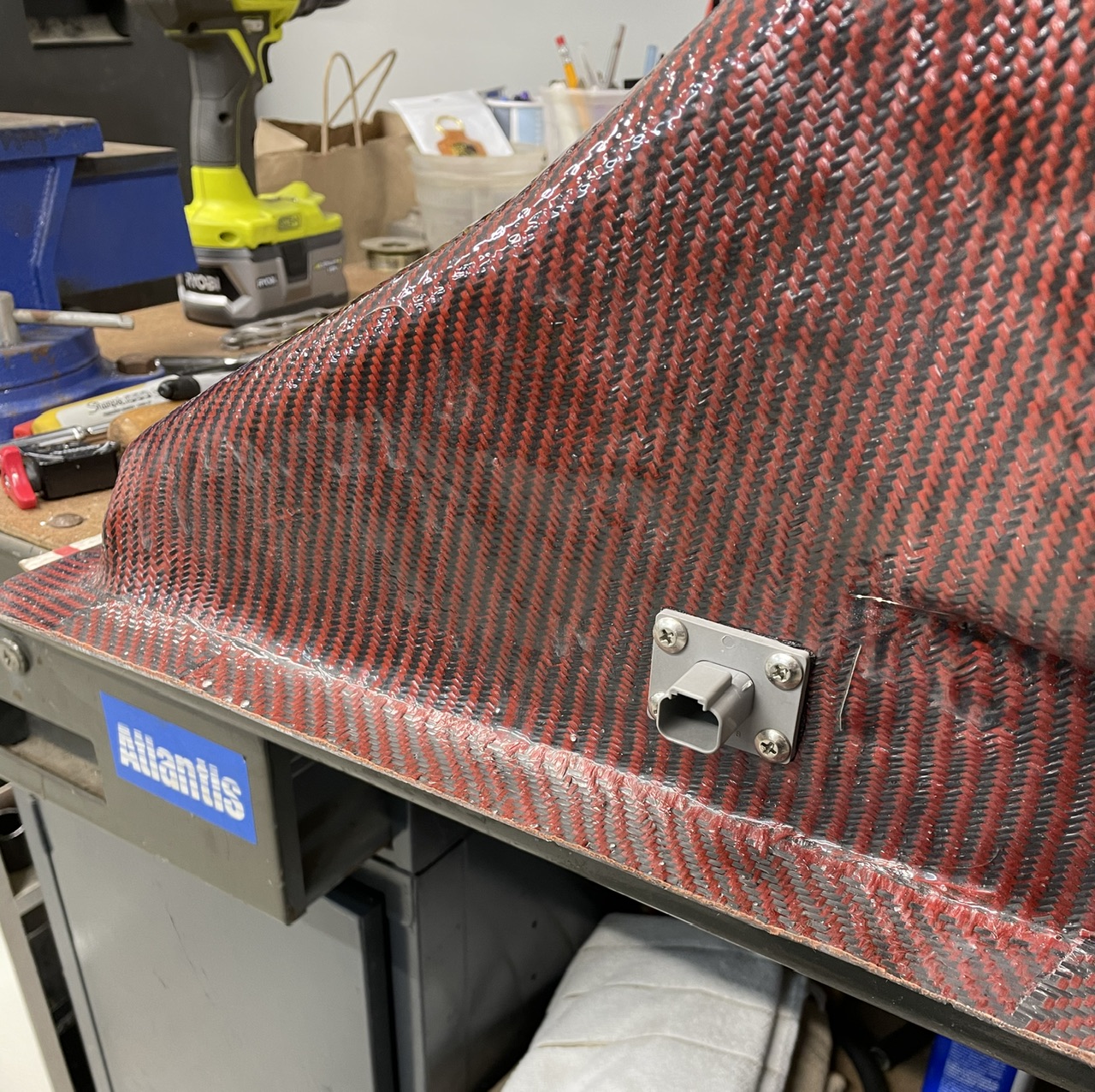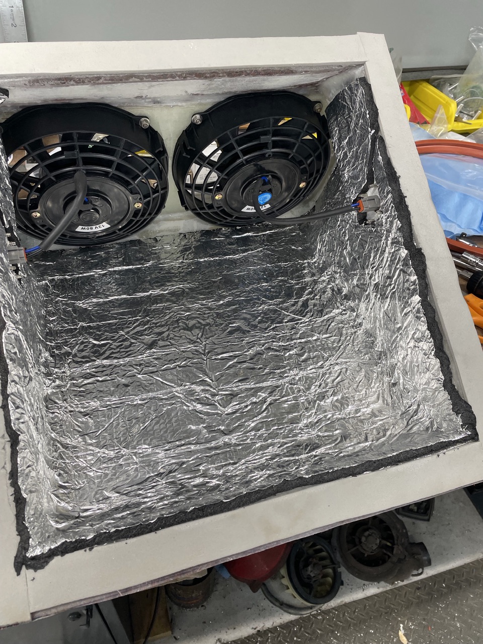Finished up the radiator exit plenum, fans mounted and wired to Deutsch bulkhead connectors (one for each fan, one on each side of plenum). I wanted to be able to pull the plenum for cleaning/etc, so the connectors will make that easy. The factory Suby wiring harness and ECU will power/control the fans. It runs one fan until the second is needed.