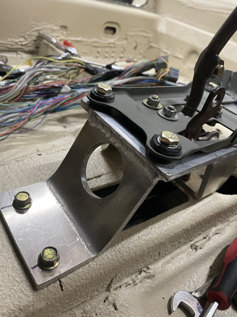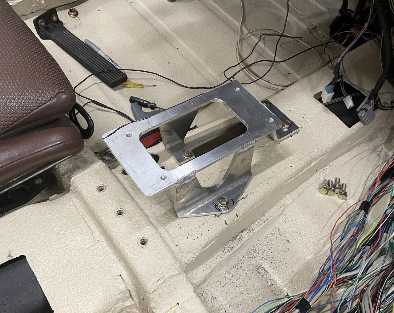 Today I decided to rework my shifter mount. The previous version was 3/4 steel tube, and frankly, overkill and heavy. I decided to scrap it and fab up an aluminum mount. The other issue with the previous version was that the harness would have to pass through it. If I ever needed to pull the mount I’d have to pull the harness back through it first. The aluminum version provides enough space to allow the harness to pass by on the outside of the mount. I did clean up the mount a bit after these pics, but didn’t get too crazy making it look pretty because it will all be hidden in the center console when done. |