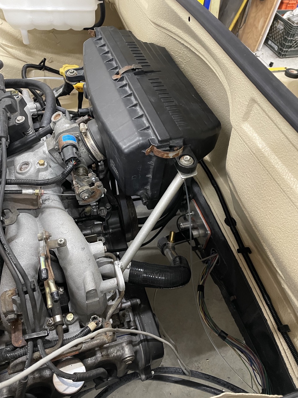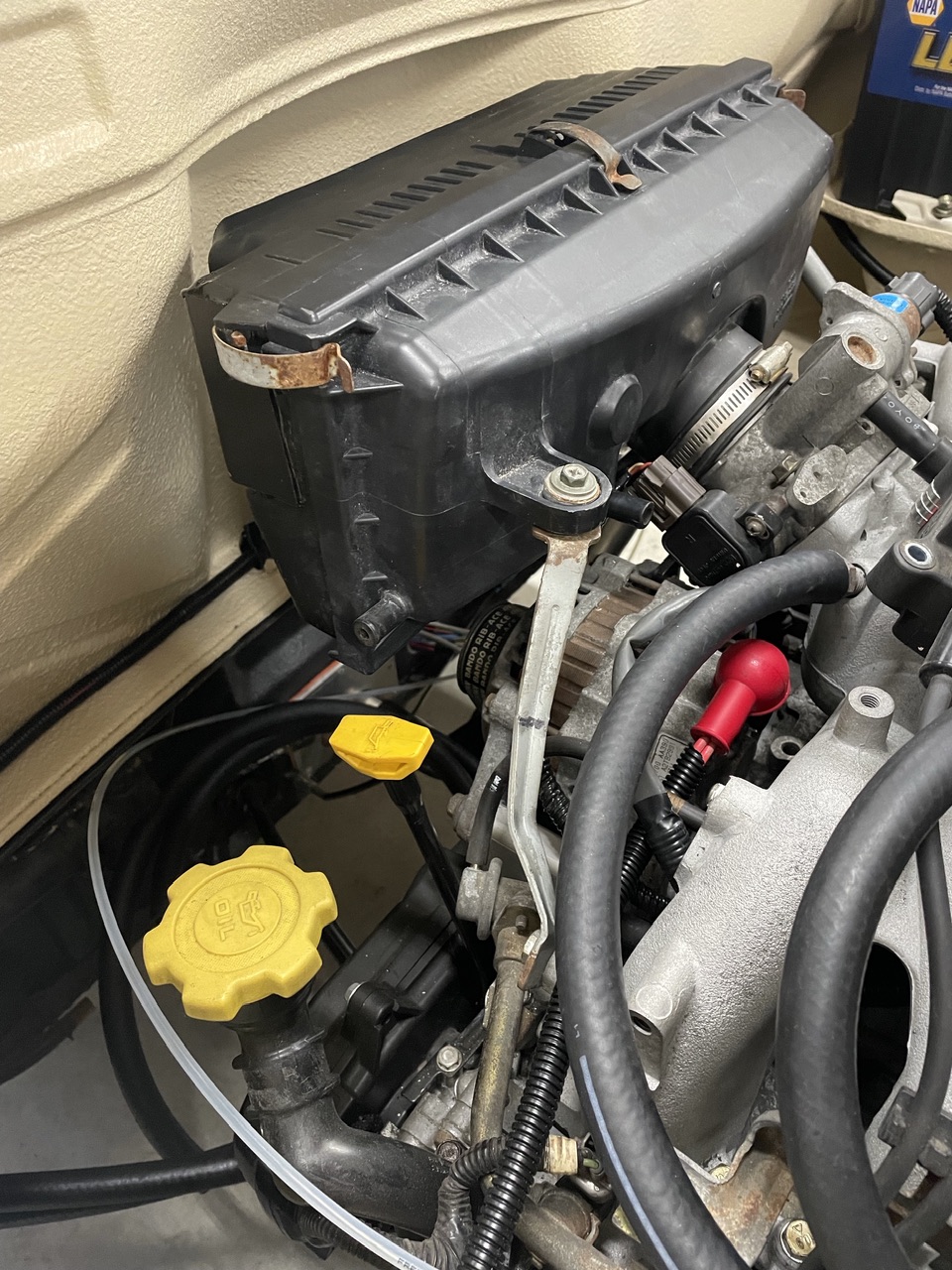 Then, because I flipped my intake manifold, I had to make some support brackets for the box. One side I was able to reshape the stock Suby bracket to fit, but the other side I had to fabricate. All done and ready for a fresh filter….. |