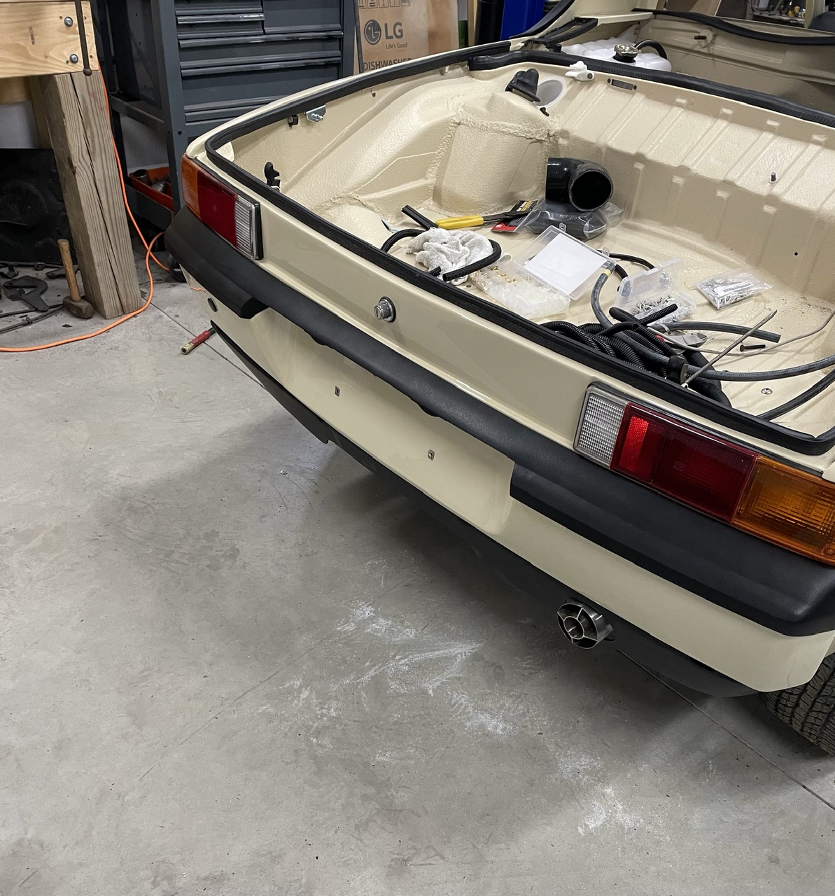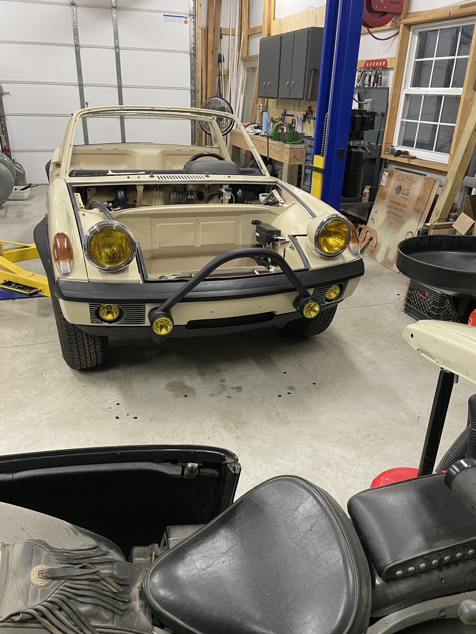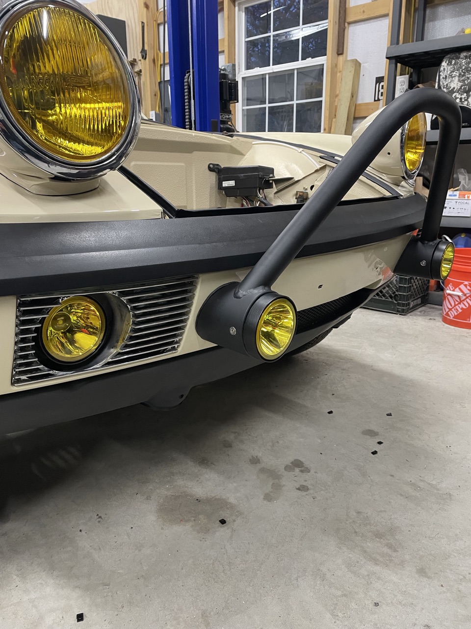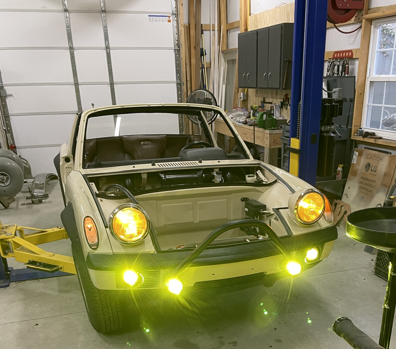 So it was a milestone day for my project. After countless hours paring down the Subaru harness to fit the 914, modifying the gauge cluster and its wiring, extending the engine to ECU harness, and generally adapting the Suby harness to work with 914 lights, wipers, fan……….I connected the battery for the first time and no smoke or flames came out! Along with no smoke or flames, everything works (all lighting, cold air blower via Suby controls, wipers, flashers, turn signals, brake lights, gauges, radiator fans, and even cranked over when I hit the start button…..yay! I have to say I feel a great level of relief that it all works and nothing sizzled. That said, I still have to wire the fuel pump once the tank is in, so there’s still an opportunity to screw it up (IMG:style_emoticons/default/smile.gif) I find myself smiling after every installment. Lights look like they belong there. |