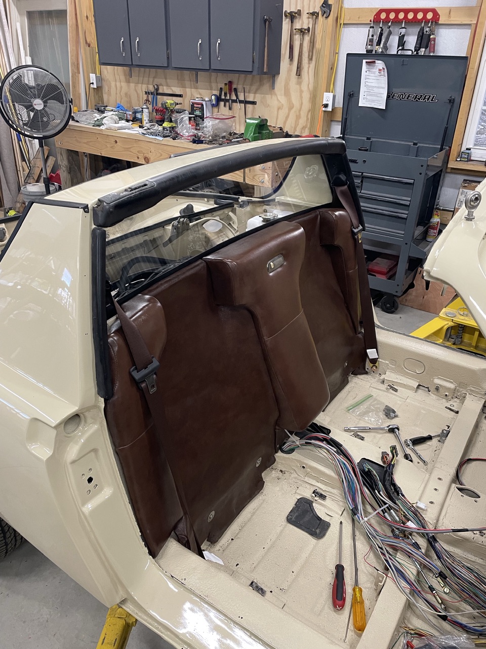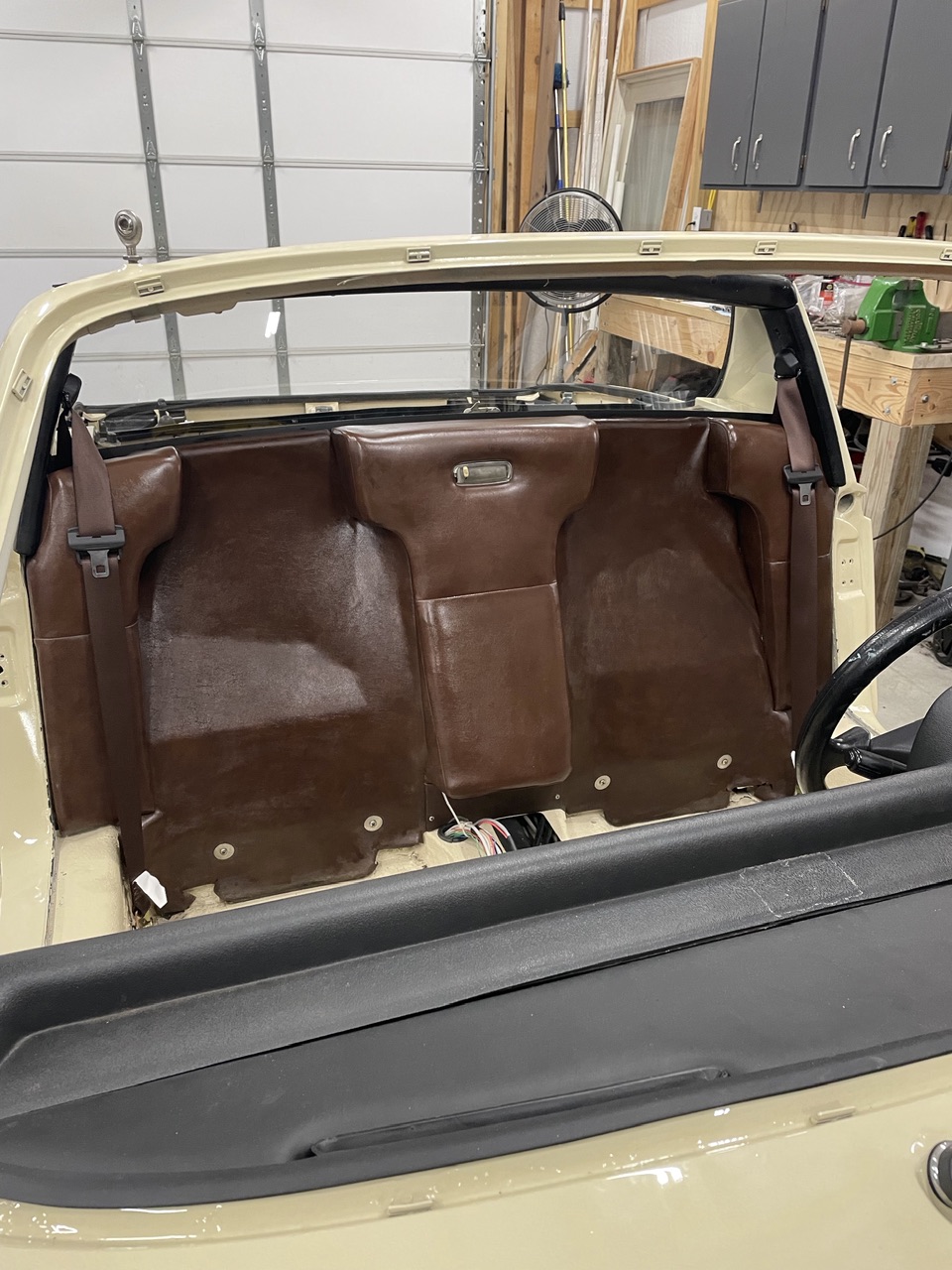 Had some interior fun today. Installed my rear window, new seat belts (seatbeltUSA), my targa trim, engine lid cable, and my back pad. I’m loving the color contrast ext to int. Beautiful back pad! (IMG:style_emoticons/default/drooley.gif) Is this an original in nice shape or something reupholstered? Really nice build! (IMG:style_emoticons/default/smilie_pokal.gif) |