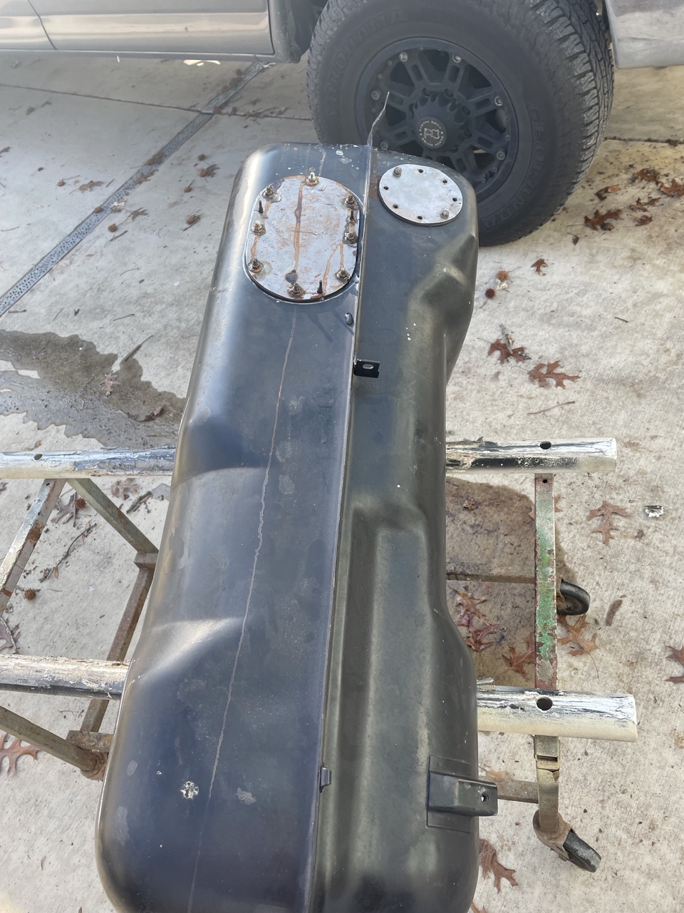 So in between other little projects it was tank cleaning 101…….I made block off plates for the fuel fill and the Subaru fuel pump openings, then filled with 7 gals of vinegar and sealed it up. Rotated the tank for a couple days to get good coverage, then drained vinegar and filled with water/baking soda mix. Rotated a couple more days, then drained the mixture and put 1-1/2 gals of wd40 to treat the fresh metal.