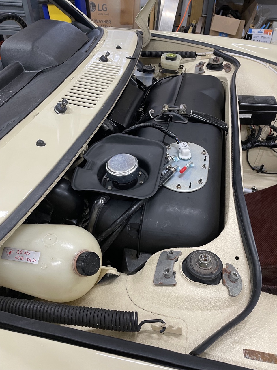 Got a couple things checked off the list today. I put the tank in place, plumbed fuel lines, and added a block off and a drain valve to the outlets on the bottom of the tank (since the Subaru pump feeds from the top). Also finished the wiring for the fuel pump and connected it up……..it’s ready for some fuel and an initial startup.