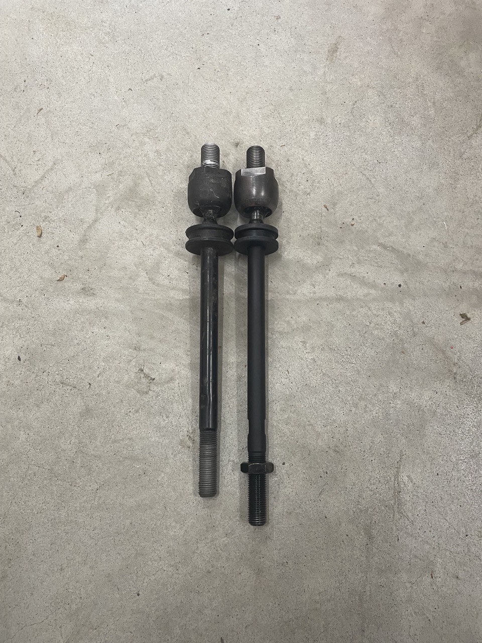 The rod ends I’m using are fairly common and aren’t too difficult to find. They are 57mm from center of the rod end to the base of the thread area. A couple of companies (Elephant Racing and Tarret) offer bump steer kits with rod ends that have a long thread section (73mm vs 57). These would be perfect to address my concern. However, they will not sell the rod ends separately from the full bump steer kit, which makes it a kinda cost prohibitive and wasteful proposition for me. I tried for weeks to find a similar 73mm rod end but came up dry. I don’t know what folks do who bought bump steer kits from these companies when the rod ends wear, which they will over time. So, I started looking for another solution and found that the turbo tie rods for the early 911s are 18mm longer that the kits we buy for our 914s. This fixed any issue with thread engagement and allowed use of the more common 57mm rod ends. I actually had to remove 7mm from the tie rods to ensure range of adjustability. Time for an alignment and some road driving! I thought I’d share this for anyone who attempts a similar mod or creates their own bump steer kit when lowering their 914. Standard turbo tie rod on the left, 65-68 911 turbo tie rod on the right….. |