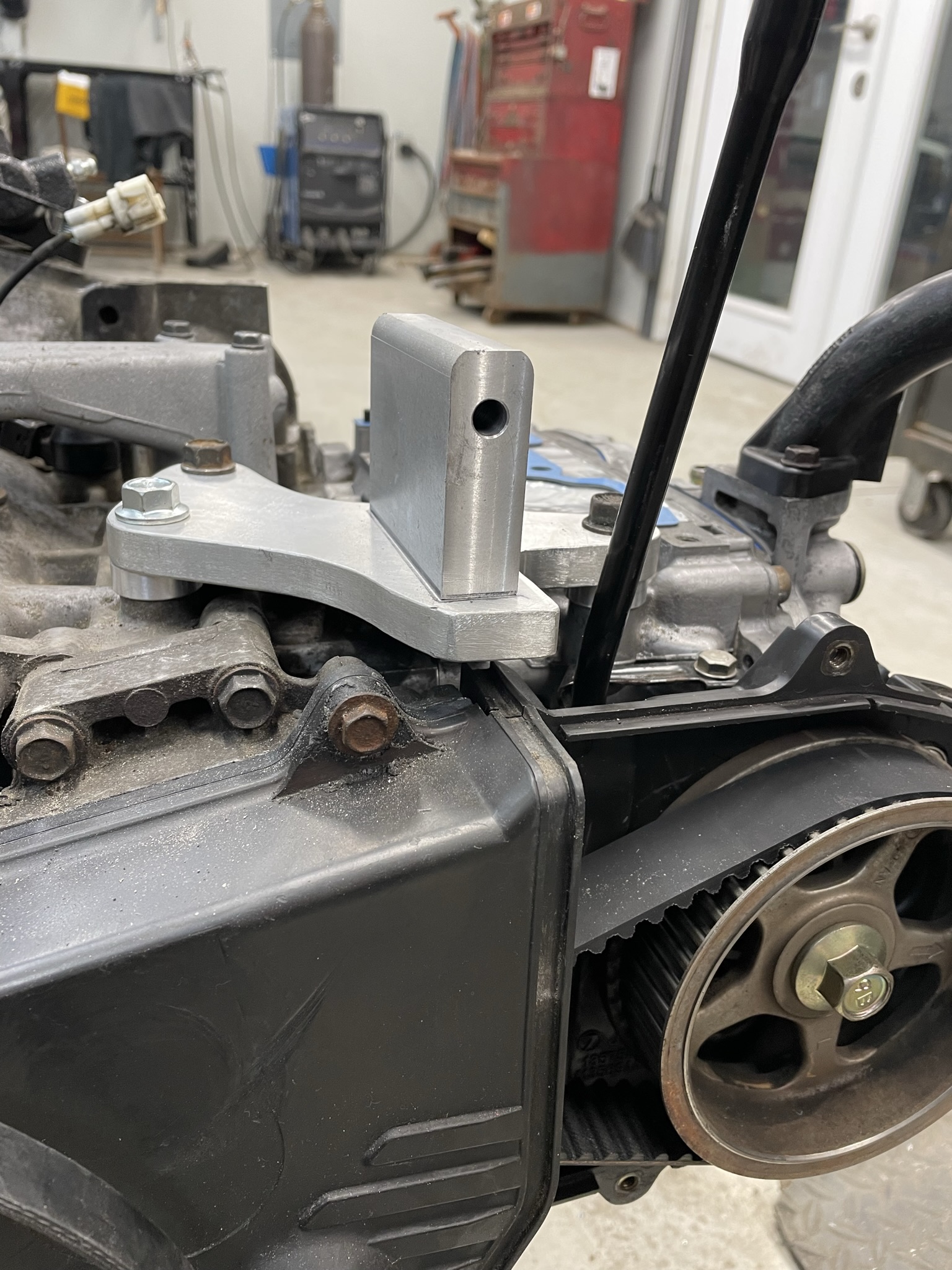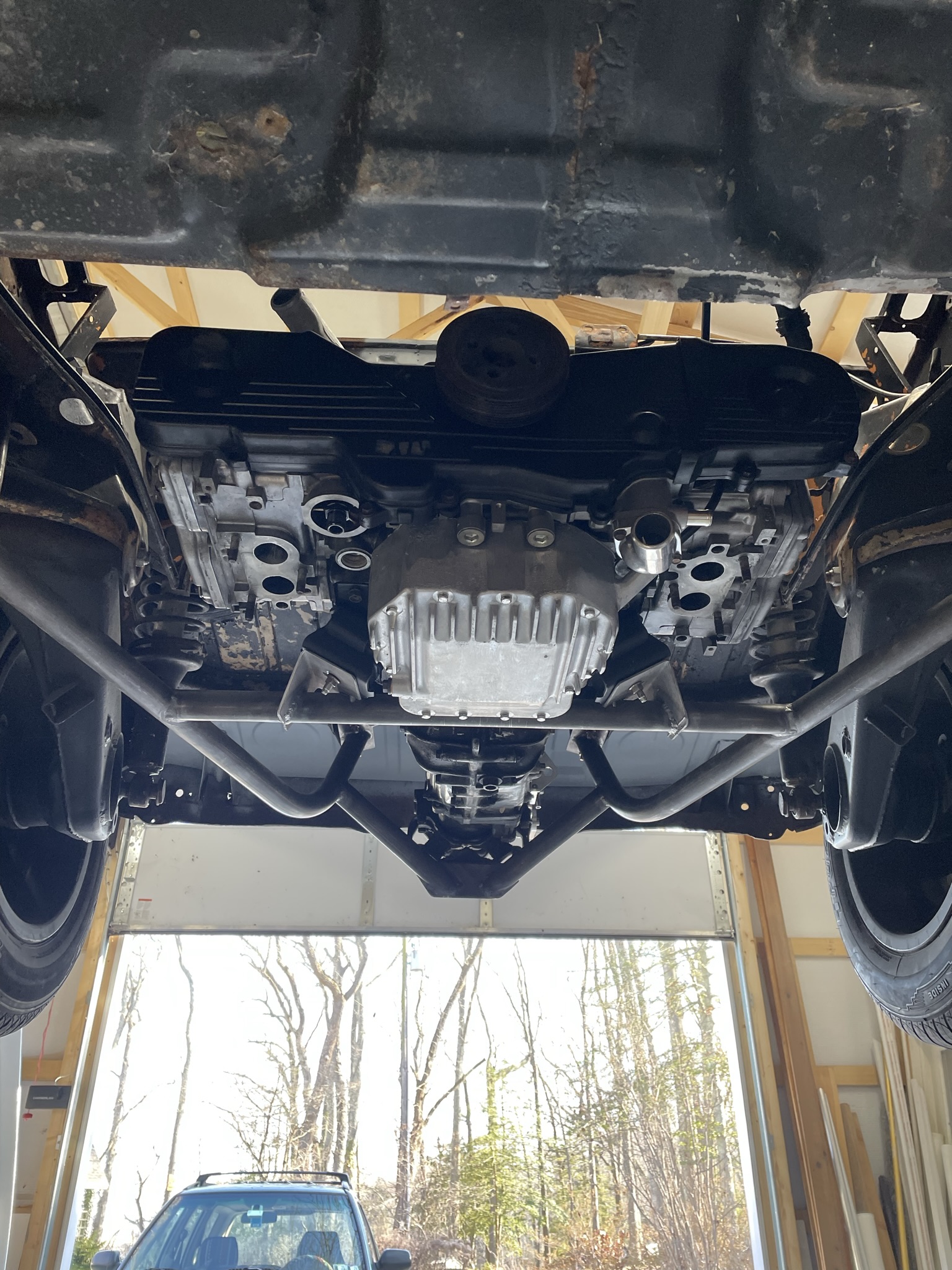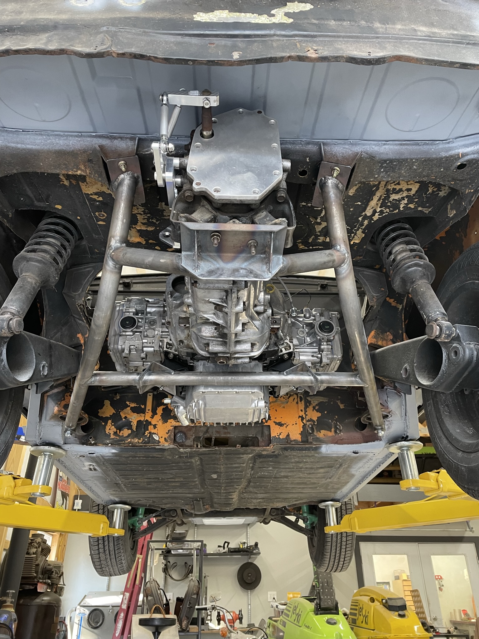 First test fit of the engine/trans. Everything fit up well. I was concerned about the starter and clutch slave cylinder but all cleared just fine. Looks like my cradle measuring/ guessing/cursing was spot on.