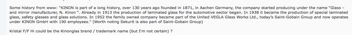 kinonglas is the manufacturer of the windscreens. and kristall F/F HI might be the trademark name of the clear laminated glass. (if the info i found is right - from an early 911 forum). they were bought out by saint gobain, so a division of s g as per sekurit. though no certain they were bought out by early 70s. had the technical set up to do laminated windscreens. speciality item. sekurit another factory doing flat/flatish glass. probably just toughened. certainly sigla did windscreens originally for mercedes and porsche (for early 911s) but possibly by some stage in the early 70s saint gobain was supplying all the glass for 914s at karmann? so it could all be S G glass in my 74 built in jan 74. getting curious enough to carefully pull out my spare screen. |