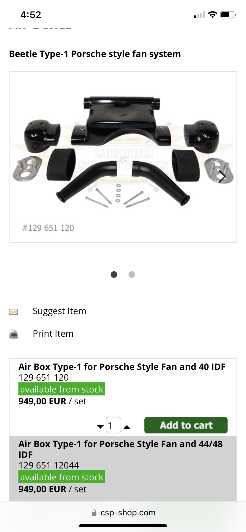 Where does that ship from? Individual, conventional paper filter, assems cost a lot less than 1k+ a pair. What is a ‘Porsche Style Fan’? Like the FAT style one? Free shipping for a set from CIP1. CSP is out of Germany I think. Yes it is for a Type 1 engine with an upright Porsche style shroud. I have no idea how it will fit to an 914 with an engine lid or rain tray but I would expect that it is probably made of ABS plastic or fiberglass and could be a starting point for modification. Brent definitely hand fabricated something similar and made it fit so I’m sure the concept is valid. If anything, I’d probably just go with the CB aluminum setup. I ran the K&N style on IDFs for years and never had a problem but given the options today, I’d probably run the foam pre filters that are available just to provide a little more filtration. |