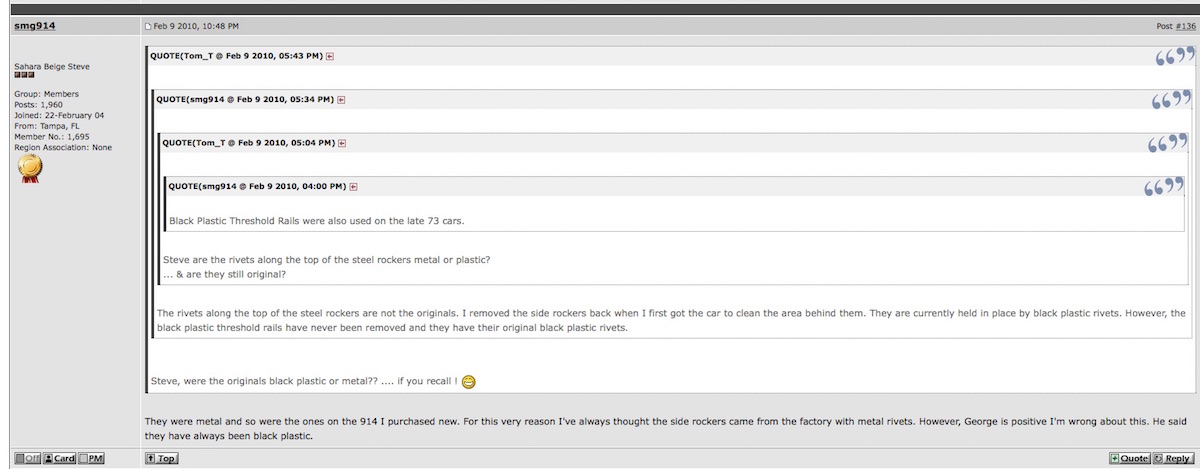 @KELTY360 hmmmmm! i thought to myself i know there is an in depth photographic record of S G's sahara beige 74 2.0 in originality section. went snooping to see if there were photos of sill. uncovered a very interesting exchange. unoriginal sill rivets - incorrectly restored? (IMG:style_emoticons/default/confused24.gif) http://www.914world.com/bbs2/index.php?sho...1921&st=120 seems to be a bit of uncertainty around the business of what was on a 74. and maybe 73? leaving aside what was on an early car. the black plastic rivets that S G quotes dr914 says were on all 14s def agrees with my files on 75 1.8s. they sure look like they got black rivets. S G's comments about what were on his super clean super original car when he bought it, before he changed them to black, def agrees with my files on 74 1.8s and the 74 cars being discussed here a page earlier. |