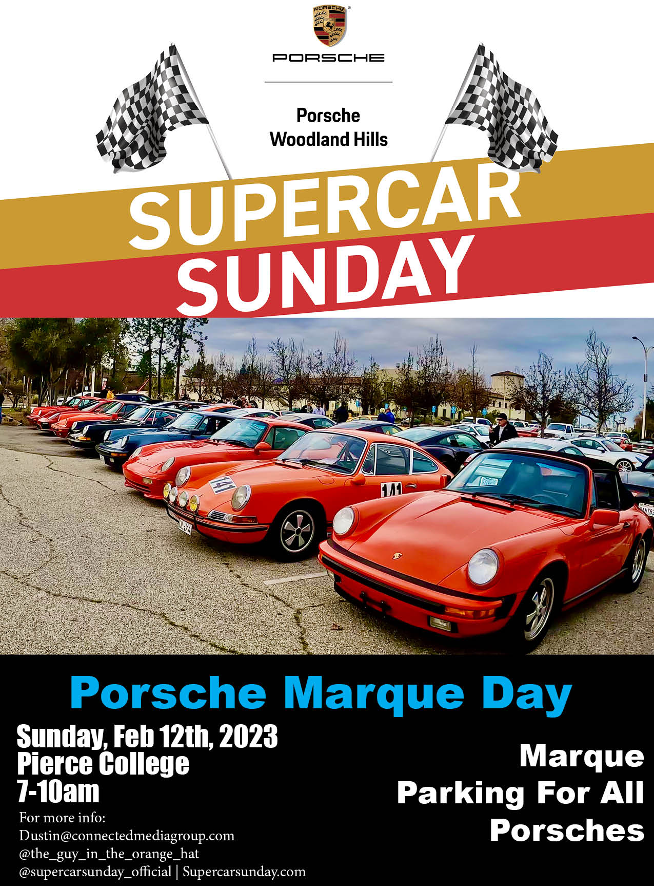 Every second Sunday of each month is Porsche Marque Day at Supercar Sunday in Woodland Hills. The event is presented and sponsored by Porsche Woodland Hills. You are invited to Supercar Sunday Porsche Marque Day! There is "Corral" parking for all Porsches and complimentary donuts and gifts from Porsche Woodland Hills. Supercar Sunday is open to all makes and model but always features Porsche on the 2nd Sunday. There is no cost to attend. On Porsche Marque day we get a great showing of Porsches...from the early cars to cup cars...to 918s...air cooled, water cooled and custom Porsches...it is truly an amazing variety... hope to see you there…. The event is at Pierce College in Woodland Hills. Please use the Victory Blvd. and Mason St. entrance as the physical address takes to you the wrong side of the campus. Time: 7-10am. Instagram: supercarsunday_official Attached thumbnail(s) |