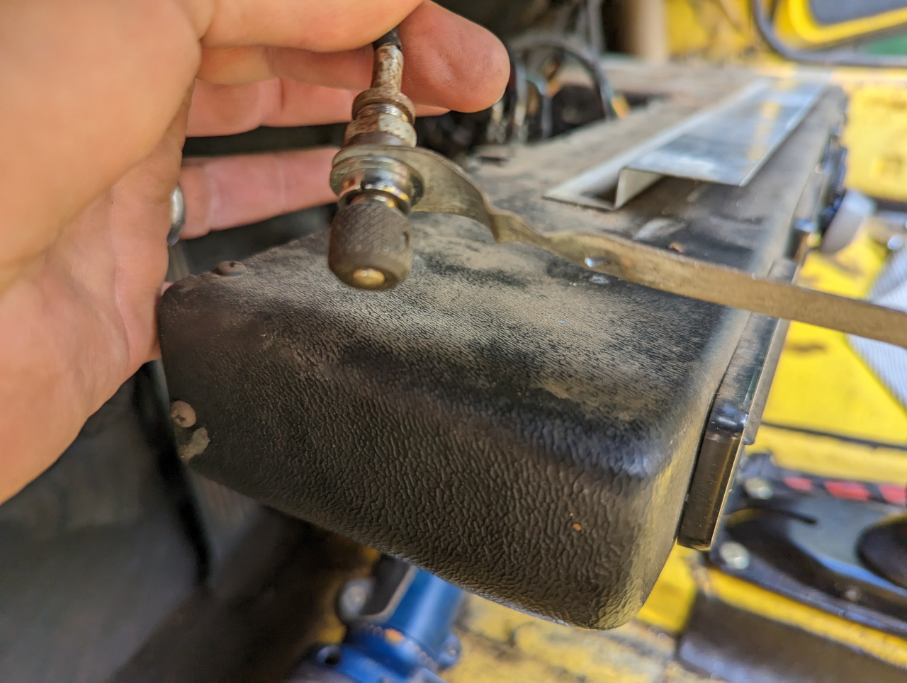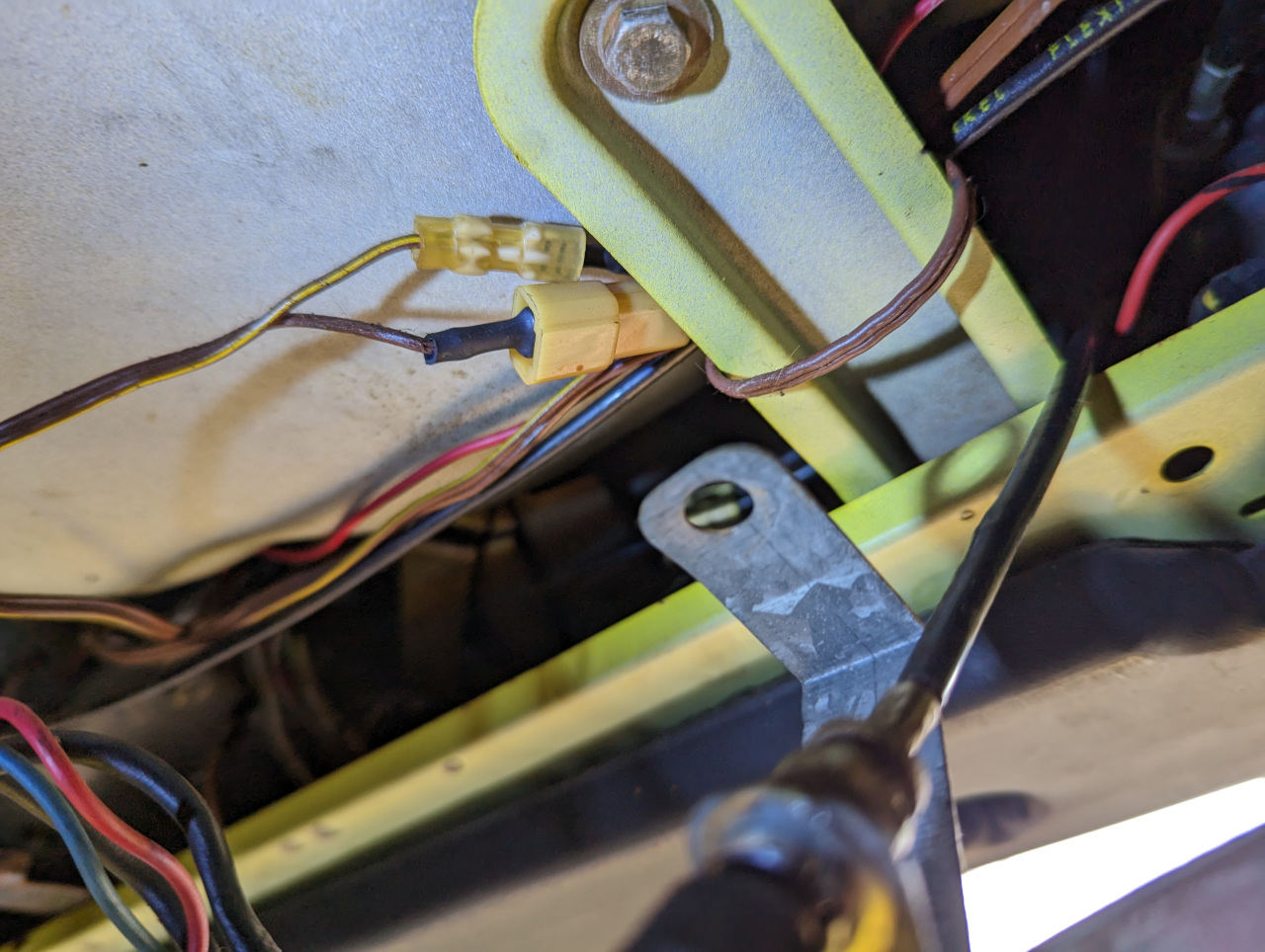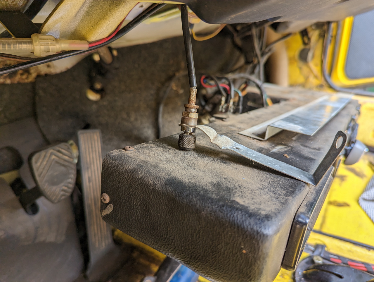 While peeling off the nasty 50 year old Perlon carpeting, I dropped the dealer-installed A/C unit on my 1973 1.7L. I found that there was a weird control knob connected to a small metal bracket that was pop-riveted to the back of the under-dash A/C unit. It was also secured to the underside of the dash with a 1/4" sheet metal screw. The cable that extends from the switch goes up into the instrument area, and it does not appear to be related to the A/C unit itself. Any ideas what it could be? Possibly a felonious odometer rollback device? The odometer is ganked on the car, it reads 4500. But just wondering if anyone has seen something like this before? TIA, -- mike |