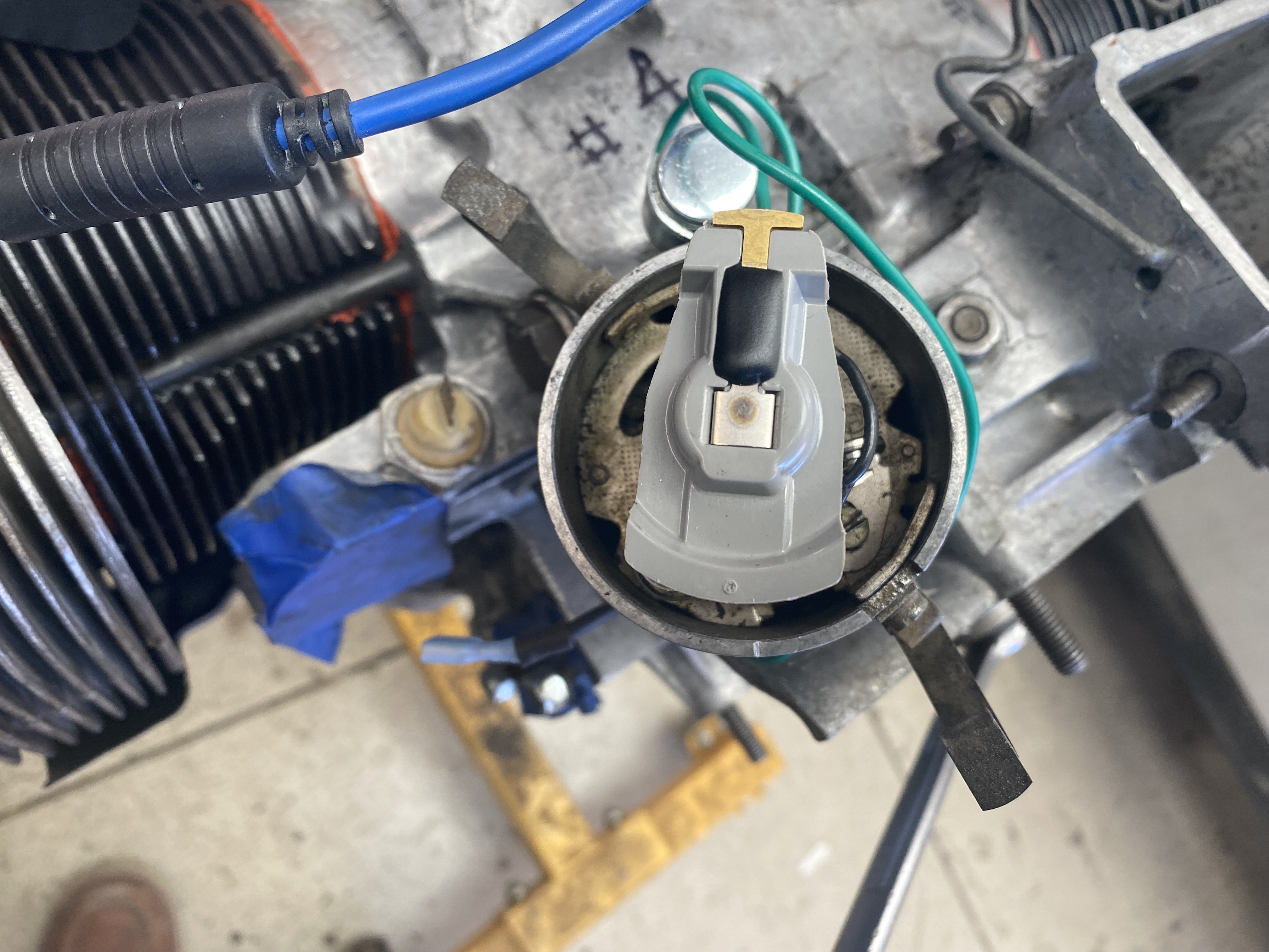 The piston will be at TDC twice during its 4-stroke cyle. As already mentioned, it looks like you're on the wrong stroke for TDC on the #1 piston's compression stroke. Use the timing mark on the fan (if it's not there, put a mark at TDC for #1 piston on its compression stroke) by unscrewing the plastic plug in the fan housing or some flywheels have it marked so it shows as TDC when the "0" mark is even with parting line at the top case. When you have the motor at TDC #1 on compression stroke, the distributor rotor should be pointing at that mark on the distributor rim. If not, take steps to align your distributor like the drawing posted above. Best wishes with the new-to-you 914! |