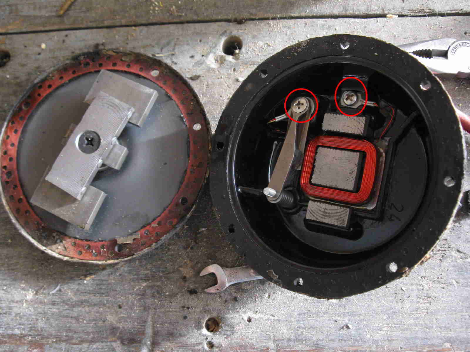 We have two original horns. One worked fine when wired to a car battery. The other is silent. Luckily the silent one has bolts instead of rivets so I could easily open it up. The corrosion doesn't look too bad to me. The wires aren't broken. I used some sandpaper to try to clean between the contacts. The contact default state appears to be closed. Is that correct? It takes a surprising amount of pressure to separate the two. What possible issues could there be with the diaphragm, other than it being perforated? I found a couple threads where people started to discuss possible causes, but stopped short of recommended any repair procedures. Thanks. |