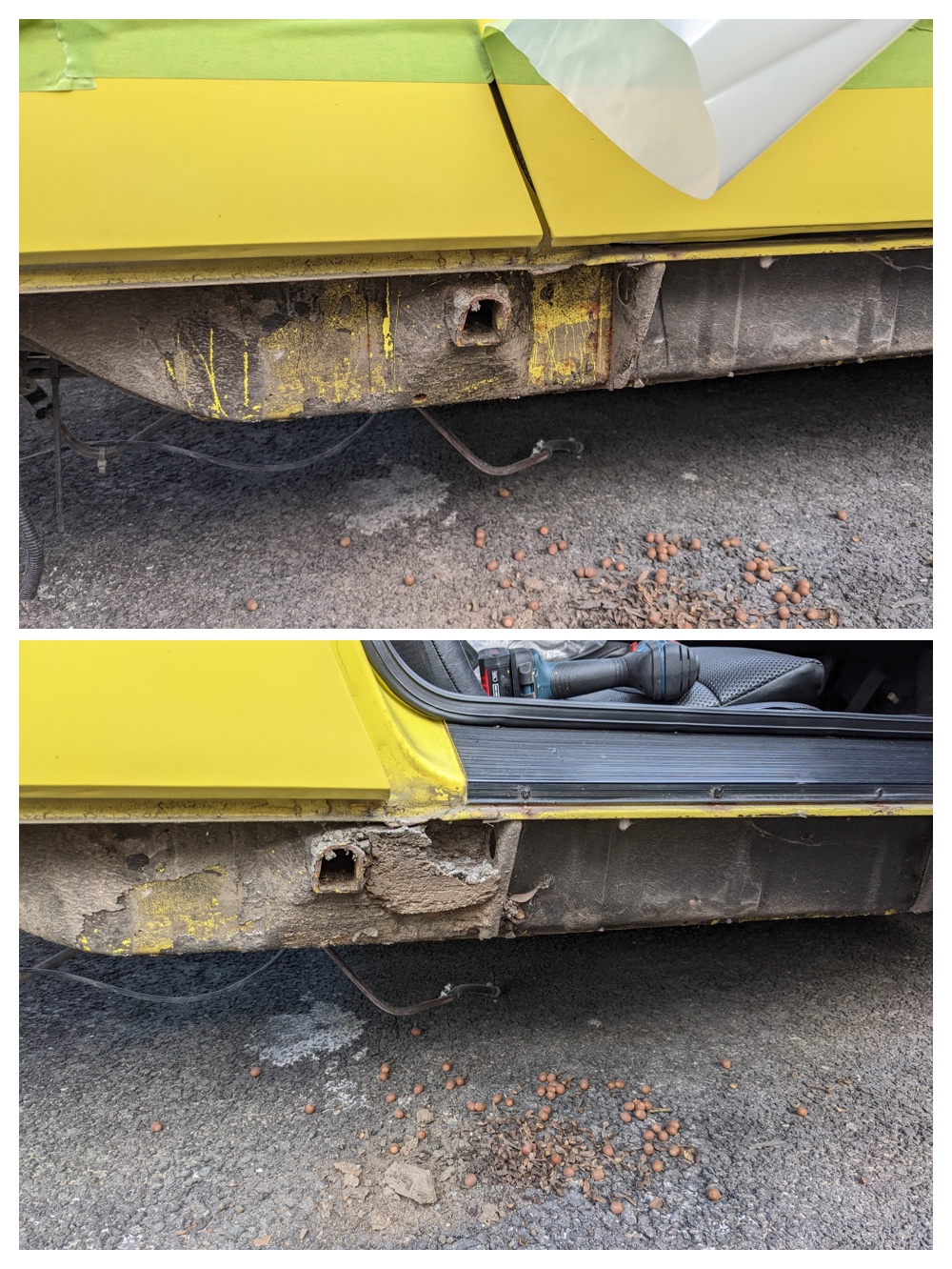 The ziebart runs across the underside of the sill and the rocker… pulls apart like a freshness seal, except there’s nothing fresh under there…