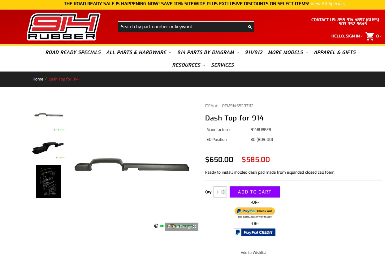 We have these on sale for a limited time. https://914rubber.com/dash-top-for-porsche-914 Attached thumbnail(s) |