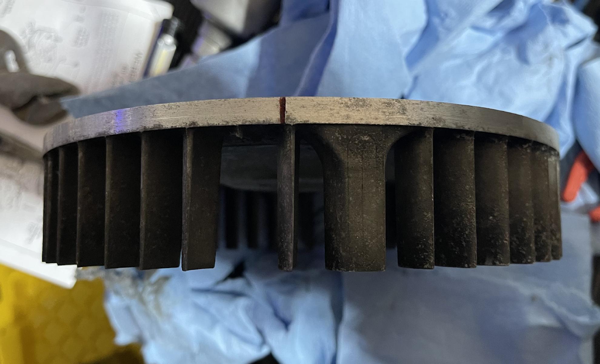 How did Porsche expect technicians to be able to set timing to 7.5 advance at 850 rpm as my timing sticker states? 1.8L engine has a 7.5 degree timing mark on the impeller. At this point with so many parts having been swapped mix and match on 914s you’re liable to find a 7.5 degree mark on others including those that may have been added at a rebuild. As a rough approximation 7 degrees is about 3/4 of the distance between impeller blades. ![]() thanks for posting this. Is there any difference between the 1.8 and 2.0? the pic below is the actual impeller from this engine. It had some broken fins so we swapped it with another one from a spare 2.0. Nothing but the 27 line, no 0, no 7.5 mark. The impeller we put on it was from GA006291 a late 73' 2.0 I believe. It has the 0 and the 27 mark. I will have to look closely at it, now I know where to look for the black line. I hear what your saying about "at this point" I do believe this engine is original to this car; both have low production #'s 00696 for the car and GC000243 for the engine. Then again it had a degree plate on the front of the engine like a bus would have. |