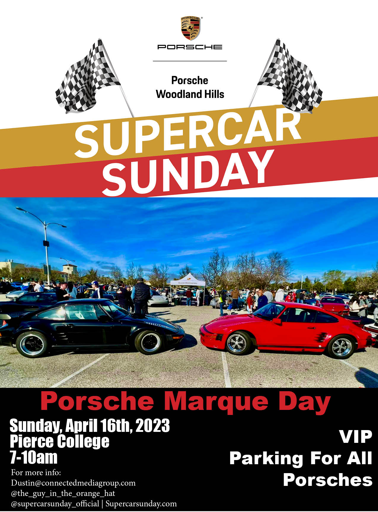 The April Edition of Supercar Sunday Porsche Marque Day is going to be awesome... We hope to see you there on Sunday, April 16th. The event is from 7am-10am. Please note, for this month we are pushing it a week due to Easter Sunday. There will not be a show on Sunday April 9th. There is "Corral" parking for all Porsches and complimentary donuts and gifts from Porsche Woodland Hills. Supercar Sunday is open to all makes and model but always features Porsche on the 2nd Sunday. There is no cost to attend. On Porsche Marque day we get a great showing of Porsches...from the early cars to cup cars...to 918s...air cooled, water cooled and custom Porsches...it is truly an amazing variety... The event is at Pierce College in Woodland Hills. Please use the Victory Blvd. and Mason St. entrance as the physical address takes to you the wrong side of the campus. Time: 7-10am. Instagram: supercarsunday_official www.supercarsunday.com Attached thumbnail(s) |