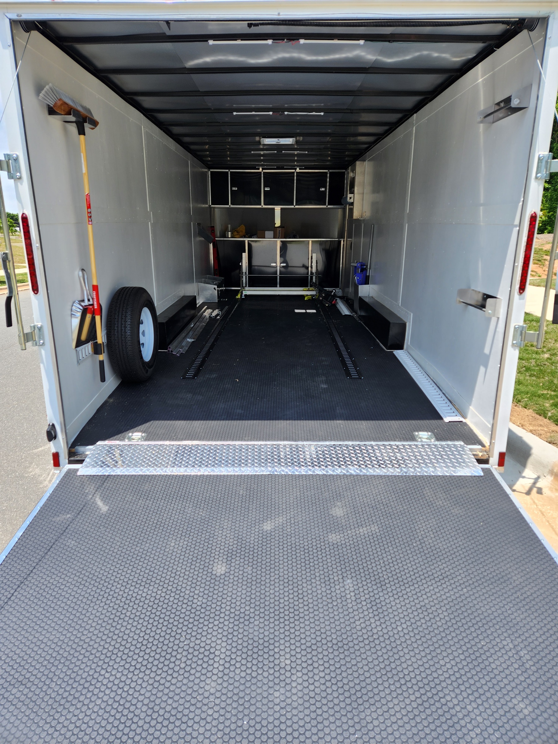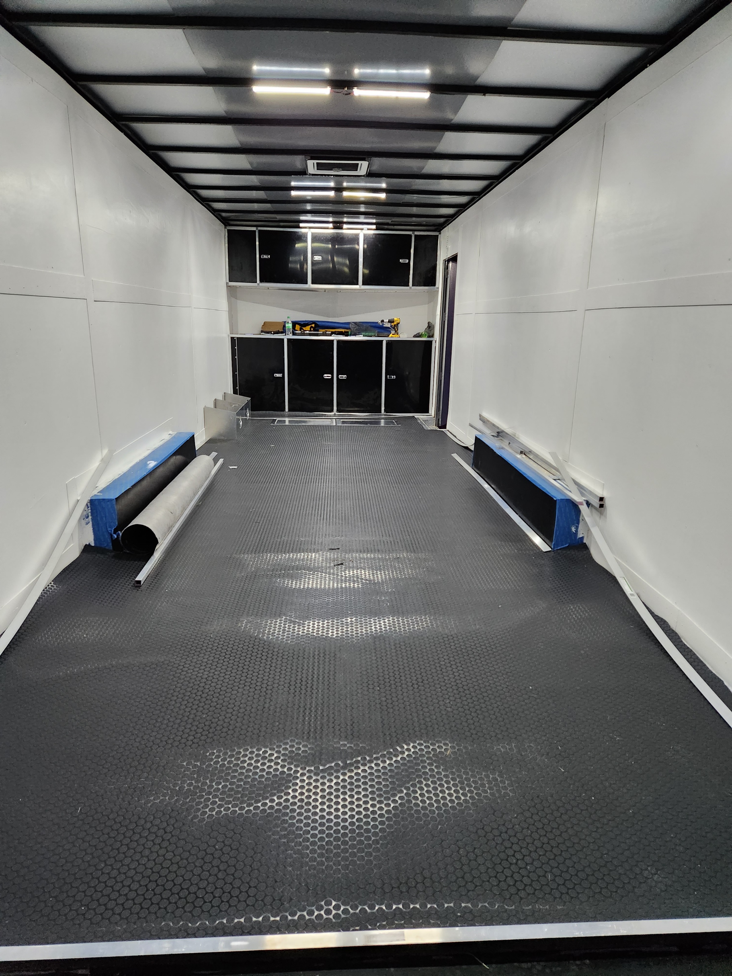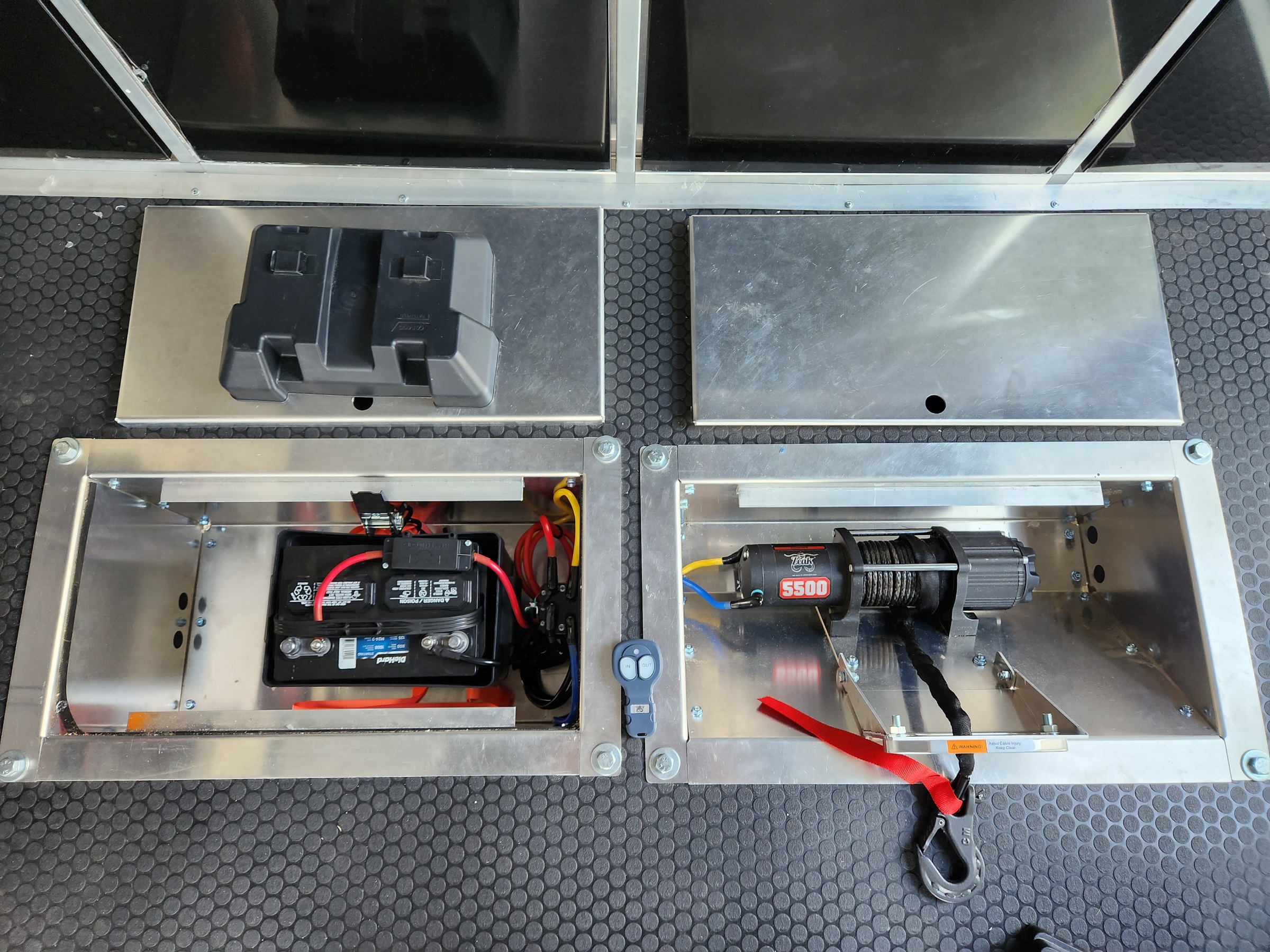 Made some good progress. Decided to glue the floor down as i really cannot stand wrinkles. Trimmed out the back door with L track. Installed the gap cover. Installed battery and hooked up the winch which now works!