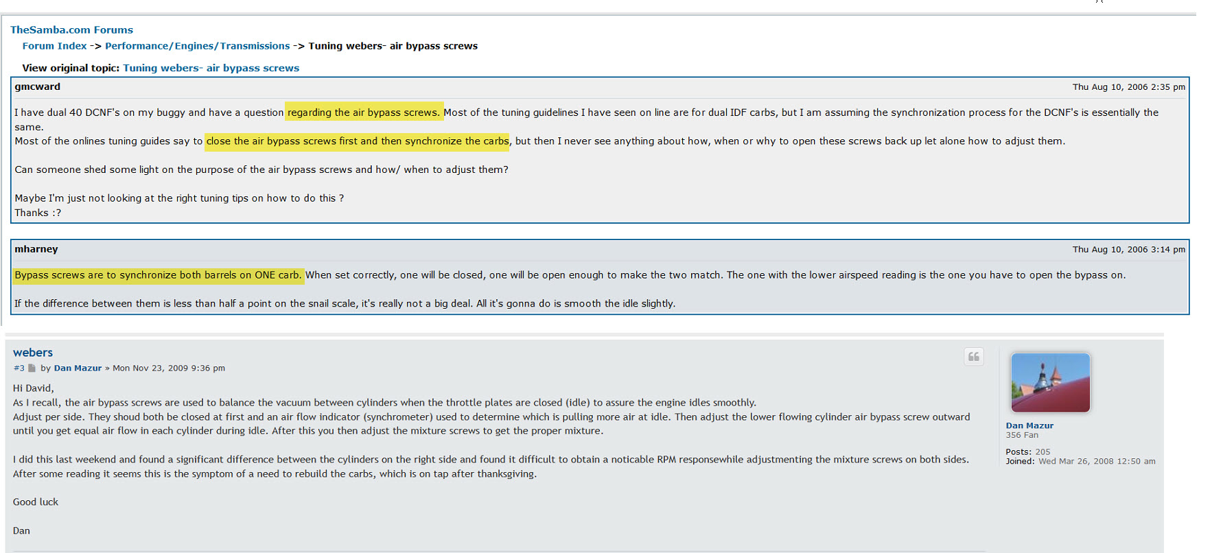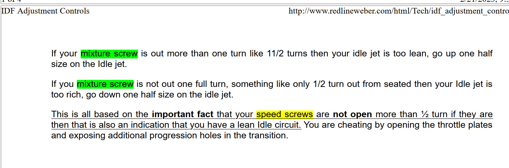 I may be missing something, but when I start from the beginning, I do this. Start car, run till warm Set idle bypass screws exactly the same Set idle arm mechanism and throttle plates exactly the same Verify throttle plate position by measuring from top to plate with a micrometer (be accurate) Turn it off Disconnect throttle linkage Start car Adjust each barrel to match with idle bypass screw Very gently, with no pulling or repositioning, adjust and attach throttle linkage. Yes bypass screws were set the same. All were closed. I did not measure the throttle plate. As it was not part of weber’s Lean Idle process. Other than that, and adding the mixture screw adjustment, that is what i did. |