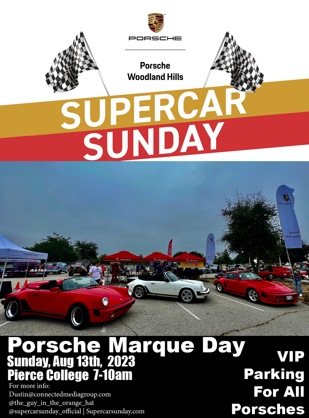 Supercar Sunday is presented and sponsored by Porsche Woodland Hills. We expect an incredible showing of Porsches as well as every other type of vehicle imaginable. There will be a VIP parking area for all Porsches. If you are attending please rsvp with Dustin and receive a complimentary $100.00 gift certificate to Lavaggio- The Art of Auto Detailing in Agoura Hills. RSVP: Dustin@connectedmediagroup.com Porsche Marque Day which has become one of the premier monthly Porsche events in Socal continues to amaze! From early air cooled cars to the latest models and modified Porsches and even track cars brought in on trailers... if you are a Porsche enthusiast, you cannot miss the Porsche Marque Days! See you at the show! Dustin Attached thumbnail(s) |