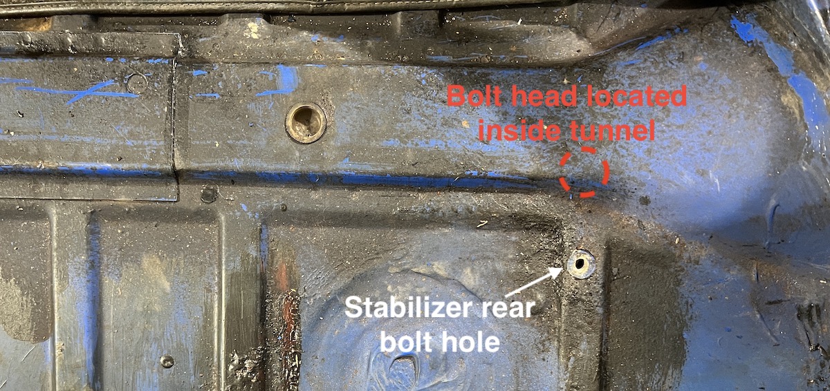 The bolt towards the front was installed top down with the head inside a tunnel. The nut visible underneath the car. Turning the nut also turns the bolt. Same on both sides. There is no hole, or tells of a former hole, in the trunk. I can't tell how the bolt was inserted. Nor can I find a way to secure the bolt to remove the nut, never mind think about getting the bolt out. (IMG:style_emoticons/default/WTF.gif) Underneath, the only access I can find is a nearby hole about the size of a quarter. I can barely get an index finger in there to feel the edge of the bolt head. A box or open end wrench is a no go. Too big and not able to get necessary angle. The rear bolt came out easily. Bolt head was accessible in the trunk. Nut unscrewed underneath and along came about 12 washers used as spacer. I could cut off the nut, but the bolt remains. Otherwise I can only imagine taking a hole saw and cutting an access opening above it. I really don't want to cut what appears to be good original metal. Other ideas? |