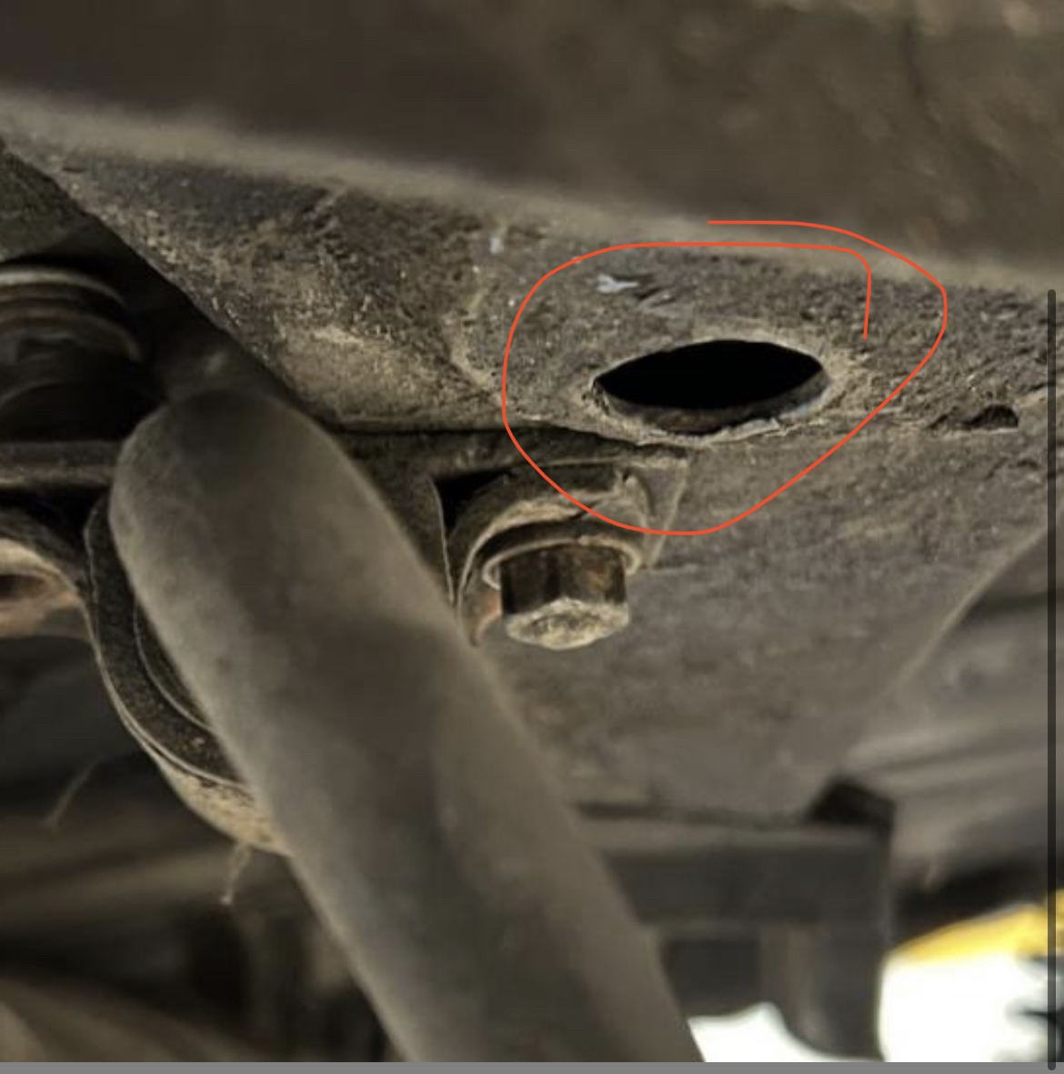 Bolt had to have been inserted through the hole circled. I agree that the nearby hole seems like the only entry point. Though I don't see how in the heck would they have stood the bolt up and positioned it for the bracket? (IMG:style_emoticons/default/confused24.gif) I guess where there's a will, there's a way. Seems super tedious. Particularly when they just drilled a hole through the trunk for the rearward hole. Thanks for the removal suggestions. I was hoping I had overlooked something obvious. (IMG:style_emoticons/default/smash.gif) Is it possible that it's NOT a bolt, but a piece of all-thread that they threaded up through the bottom and then put a nut on it from the top side (using that access hole)? |