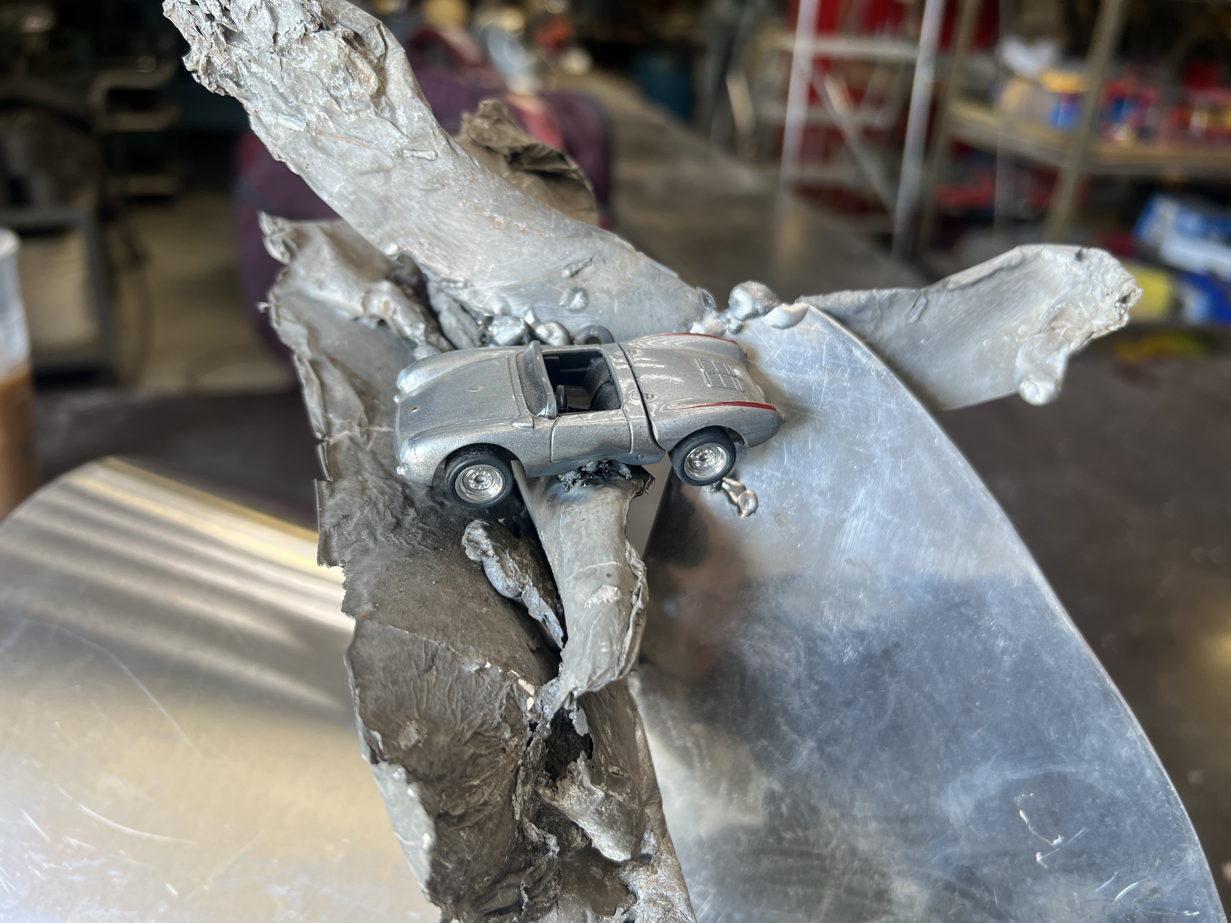 So today was strange. I'm learning with putting together all these old aluminum 550 panels that old metal doesn't like to be TIG welded. I was talking to Wray Schelin who mentioned he has a new X1 Pro 3-in-One Laser Welder and told me how great it is. I had to see if it would work on old cruddy aluminum. I had two pieces of a long ago burned Spyder and thought if this welder can weld old, half burned and melted metal, it should be the ticket! It worked like a dream, I think there is a laser welder in my future. As a bonus, I made 550 art!