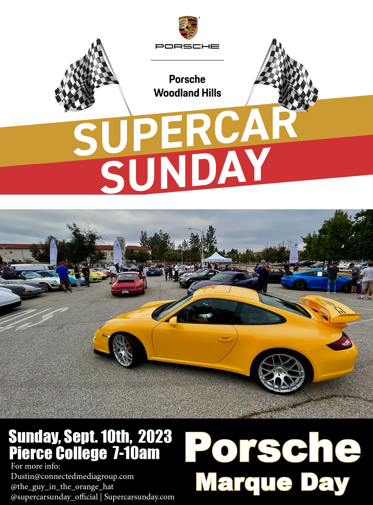 Porsche Marque Day - Sunday, Sept. 10th, 2023. Supercar Sunday is presented and sponsored by Porsche Woodland Hills. We expect an incredible showing of Porsches as well as every other type of vehicle imaginable. There will be a VIP parking area for all Porsches. If you are attending please rsvp with Dustin and receive a complimentary $100.00 gift certificate to Lavaggio- The Art of Auto Detailing in Agoura Hills. RSVP: Dustin@connectedmediagroup.com Porsche Marque Day which has become one of the premier monthly Porsche events in Socal continues to amaze! From early air cooled cars to the latest models and modified Porsches and even track cars brought in on trailers... if you are a Porsche enthusiast, you cannot miss the Porsche Marque Days! See you at the show! Bump for Sunday.... https://www.youtube.com/watch?v=b_RWv4J61Zw |
