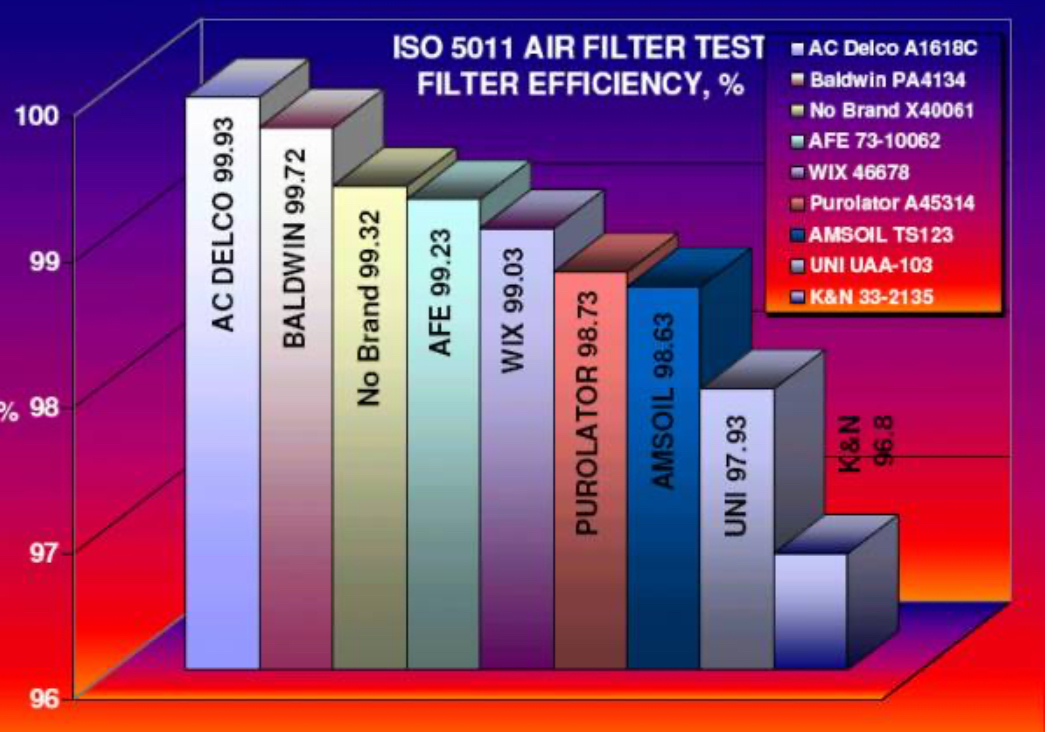 Did testing 20 years ago for a company I work for and we ran test engines to do the test. K&n filters were equal in filtration to no filter at all. Major engine wear. Better flow but with a major drawback. Paper is way better at filtering. Much less engine wear Please share data if you have it. I do not as it was proprietary testing that I performed. NDAs and such |