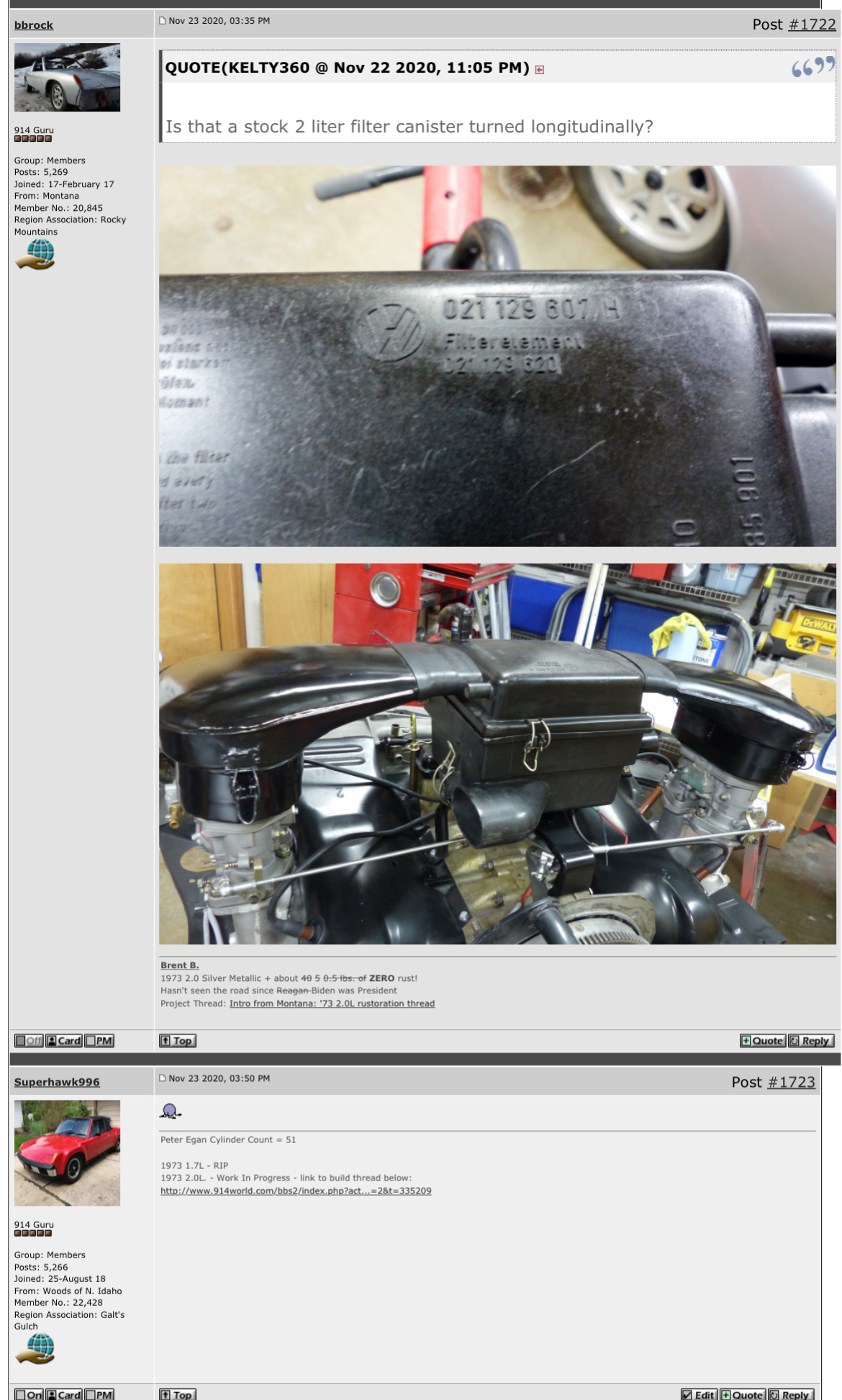 Wanted to take a moment to remind others of the amazing work he did recreating the European style air filter that worked with a standard paper element. This was all hand built (except the center air box - VW part) The details are in his thread. http://www.914world.com/bbs2/index.php?sho...290&st=1720 There are commercial versions of this available (CSP I think?) but they are crazy pricey $900 or more. But if you have a high dollar engine - it is the way to get OEM type filtration and protection for that engine. |