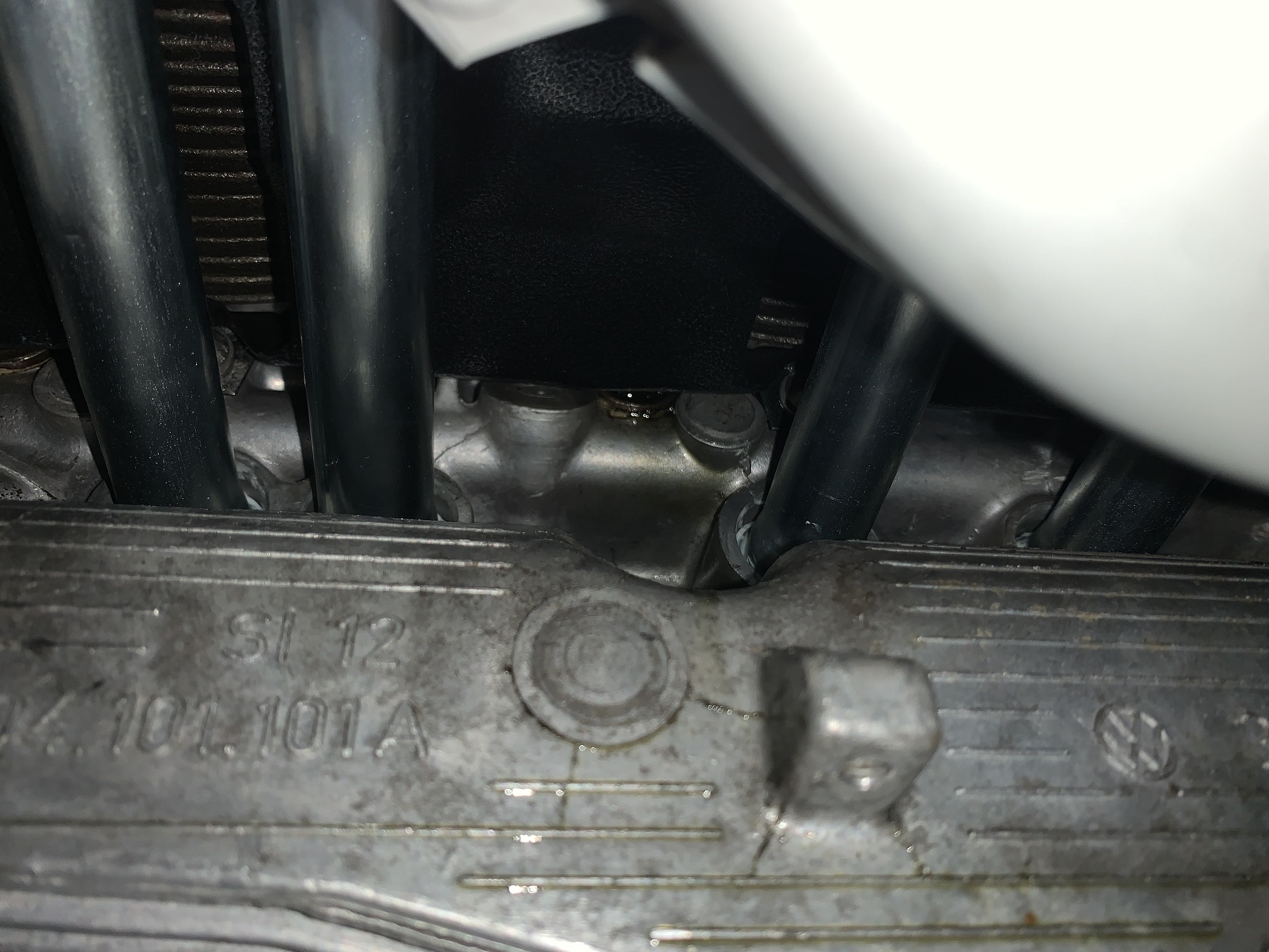 Pic below. Hard to get a good picture but you can see (well, I can see) the leak at the center bolt between the 2 push rod tubes. It is "shiny" with oil at that bolt, and there is a washer behind the bolt head.