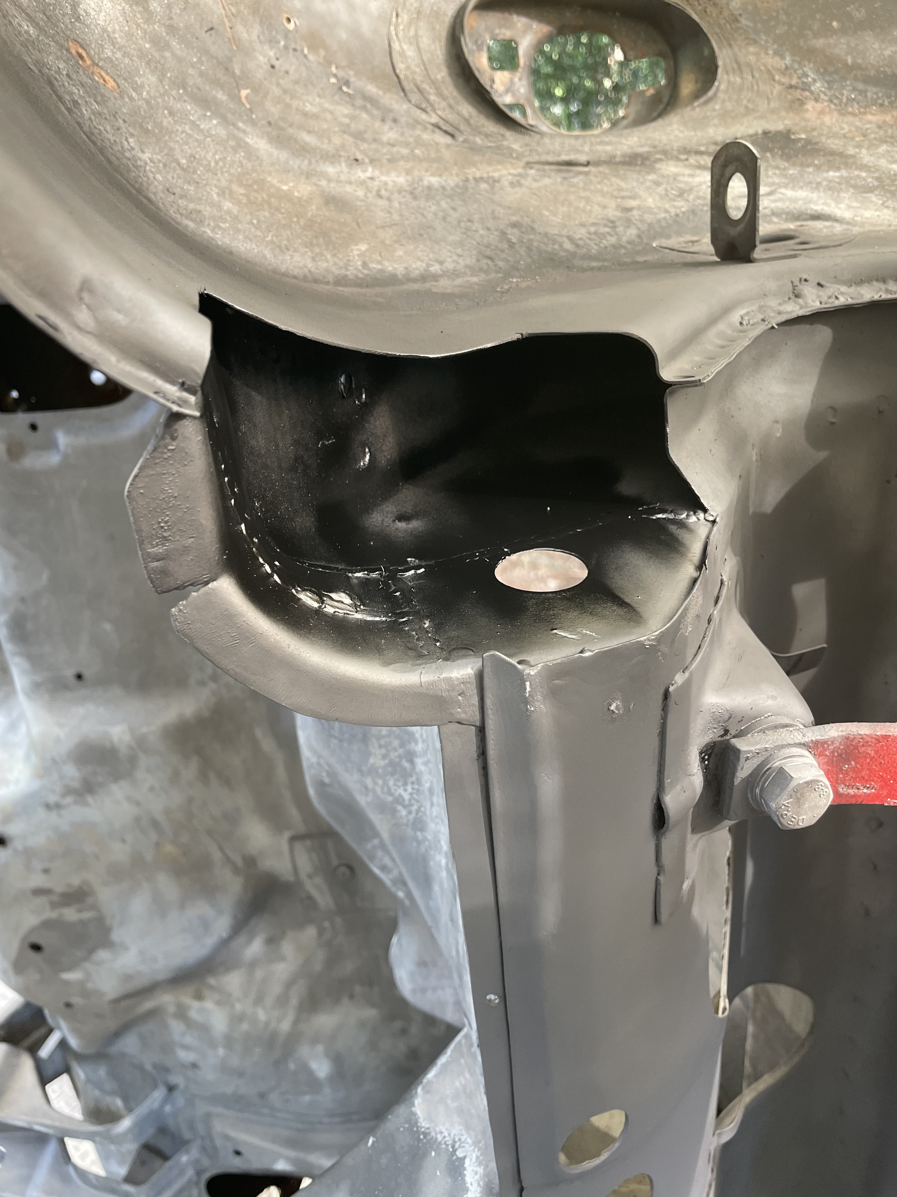 Plenty of photos here: Started on patching the raised section in the front floor piece that I removed last week. Next few photos show the patching process. My plan was to tack weld the patch into the original piece and then mount and finish welding on the car. ![]() ![]() ![]() Once the first patch was in [with the remaining metal], I then aligned and welded in the rear support piece for the steering rack support bar. Having already sandblasted this part a few days prior, I simply used weld through primer. The small opening at the rear of the part allows for some wax/paint to be shot in later [if desired]. ![]() . ![]() Next, I mounted the front floor pan. Took my time to make sure the alignment was how I liked it - used screws to hold it flat/in place. These photos show the amount of fabrication/repair necessary to fix everything. Yikes! ![]() With the front floor in place, I was able to focus on the gap where I needed to step down from my patch to the level of the front floor. This piece was surprisingly easy to fabricate/bend. I simple tacked in place and moved to the next patch. ![]() Next, I used construction paper to draw out the patch and cut it from the sheet metal. I then slowly bent to piece to match the curve of the original part and shaped it to fit how I liked it. Would be nice to have a sheet metal rolling bender thingy (IMG:style_emoticons/default/blink.gif) After all that, I tacked and welded in the final patch (passenger side) for the repair. Finally, sanded and shaped my welds using a 2 inch angle grinder and finger sander to mimic the original. The final photos show the metal prep and painting with 2K aerosol epoxy primer. Note: I didn't have a 3/4 hole saw so I used a 1 inch on the smaller of the two holes here. I hope that's ok. ![]() ![]() ![]() ![]() |