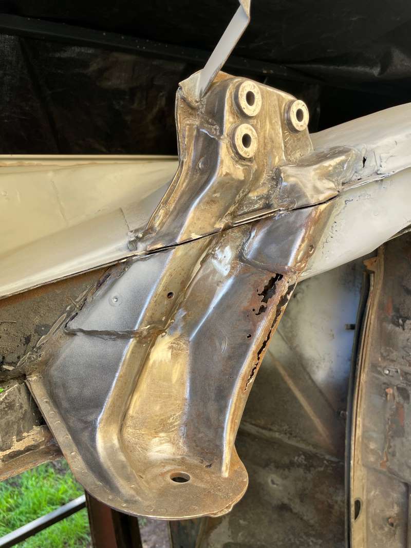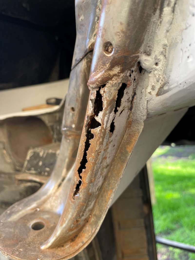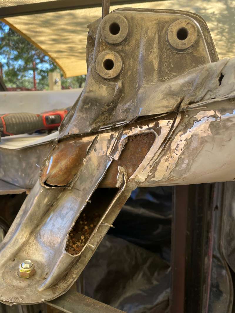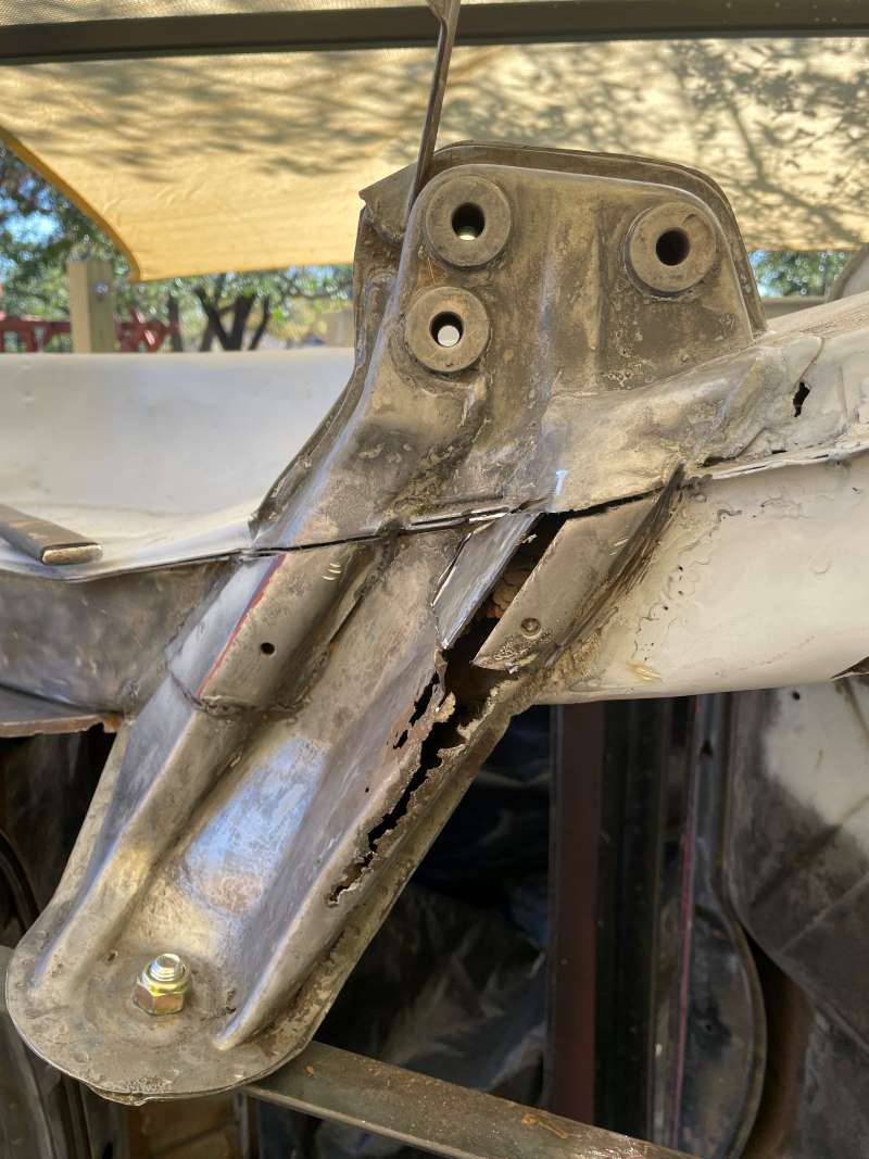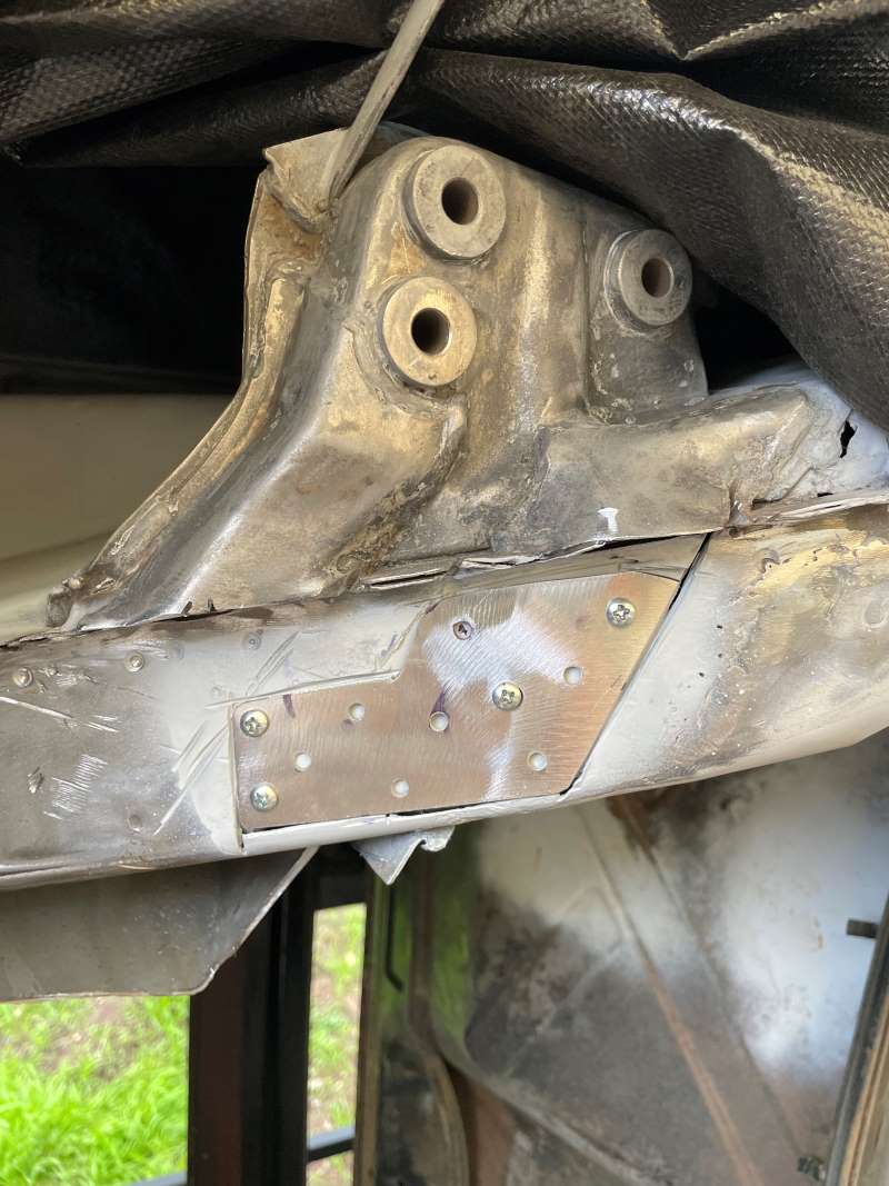 Inner Hell Hole Repair (5/2023): The first photo shows the damage! Previous repairs were present here and there. After removing the scab metal, I removed the engine mount to expose the hidden horror. After cutting away more metal I exposed a majority of the rail. Here you can see the reconstructed inner rail (gray).