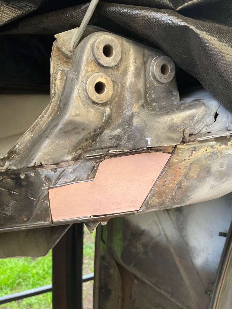 Outer Hell Hole Repair (4/2023): Here we go! My plan was to rebuild the inner structural metal first using the correct gauge metal and then remove and replace the outer sheet metal. To do this, I first cut a piece to go from the bottom of the longitudinal to some good metal up the "frame rail". You can see the use of my daughter's construction paper to set the shape of several of the repair pieces. Once the bottom was in place, I then form the missing side walls using my metal brake to match the shape as best I could - welding it in piece-by-piece. I then finished this part of the repair with a few formed pieces that go around the engine mount intrusion. Note: Nobody will see this repair so it's all about making it strong/rigid. Also, I used a ball jack to support the end of the longitudinal before cutting any metal out of the car., just in case.