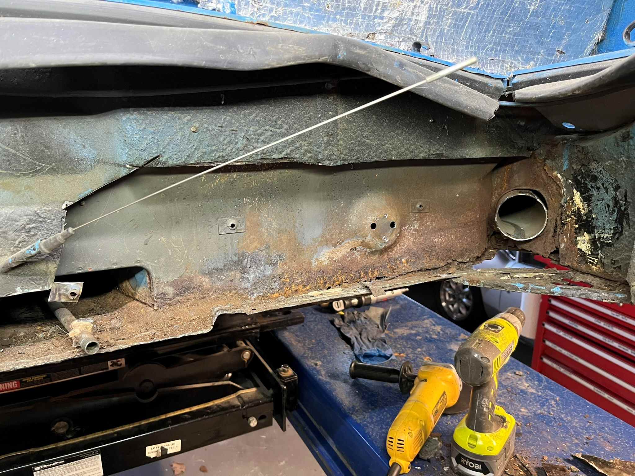 The previous owner told us the hell hole and longs had been done and he seemed like an honest car guy. So that was dumb and naive of me. It was clear that a bunch of work had been done around the hell hole, which looked good from the engine bay. When we got it home and on the lift we were faced with a rusted out lower firewall.