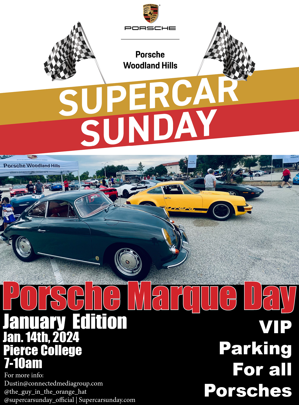 Join us for the first Porsche Marque Day of 2024! It is going to be epic! Supercar Sunday is presented and sponsored by Porsche Woodland Hills. We expect an incredible showing of Porsches as well as every other type of vehicle imaginable. There will be a VIP parking area for all Porsches. If you are attending please rsvp with Dustin and receive a complimentary $100.00 gift certificate to Lavaggio- The Art of Auto Detailing in Agoura Hills. RSVP: Dustin@connectedmediagroup.com Porsche Marque Day which has become one of the premier monthly Porsche events in Socal continues to amaze! From early air cooled cars to the latest models and modified Porsches and even track cars brought in on trailers... if you are a Porsche enthusiast, you cannot miss the Porsche Marque Days! PLEASE USE THE VICTORY BLVD. & MASON AVE. ENTRANCES FOR SUPERCAR SUNDAY. Those are the only entrances that will be open. The physical address takes you to the far side of the campus. We are in the main lot off of Victory Blvd. Lot 7. Pierce College 6201Winnetka Ave, Woodland Hills, CA 91371 See you at the show! Dustin |
