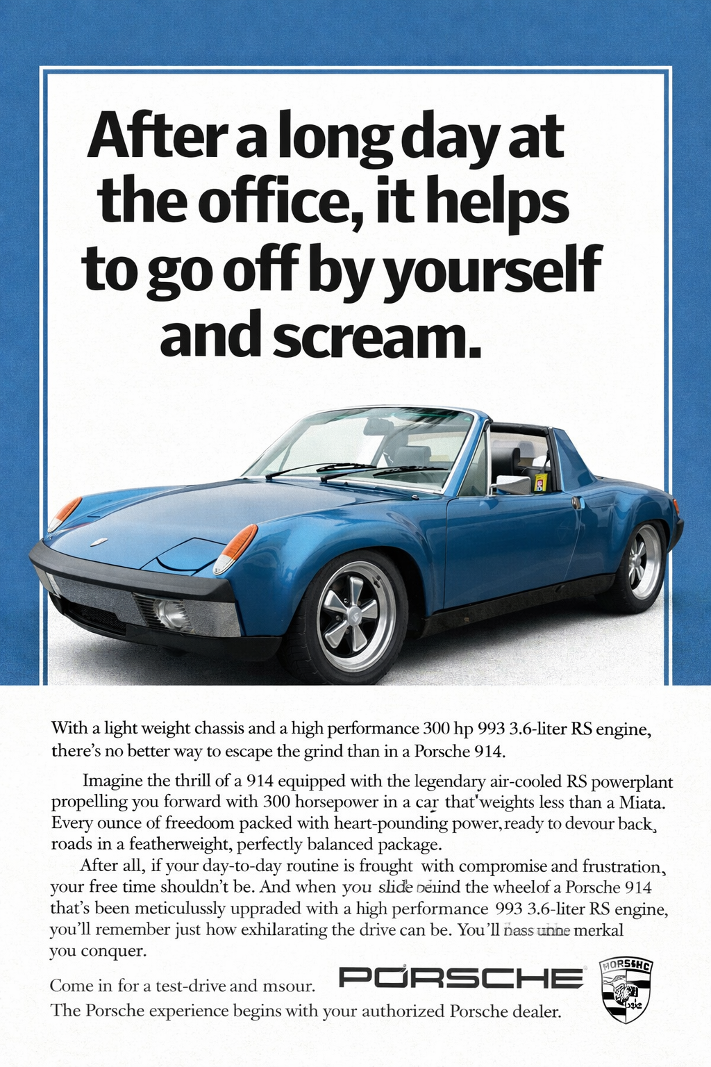 More fun with Chatgbt. I took the advertisement and said replace my car with the one in the picture and mention 300 hp 993 3.6 RS motor and it came up with the rest. It changed my car a little bit and misspelling and grammar issues, but it’s funny what it came up with. Next steps for my car are 993 tach with OBD and matching speedometer. Otherwise I am having to much fun with it to make any other changes.