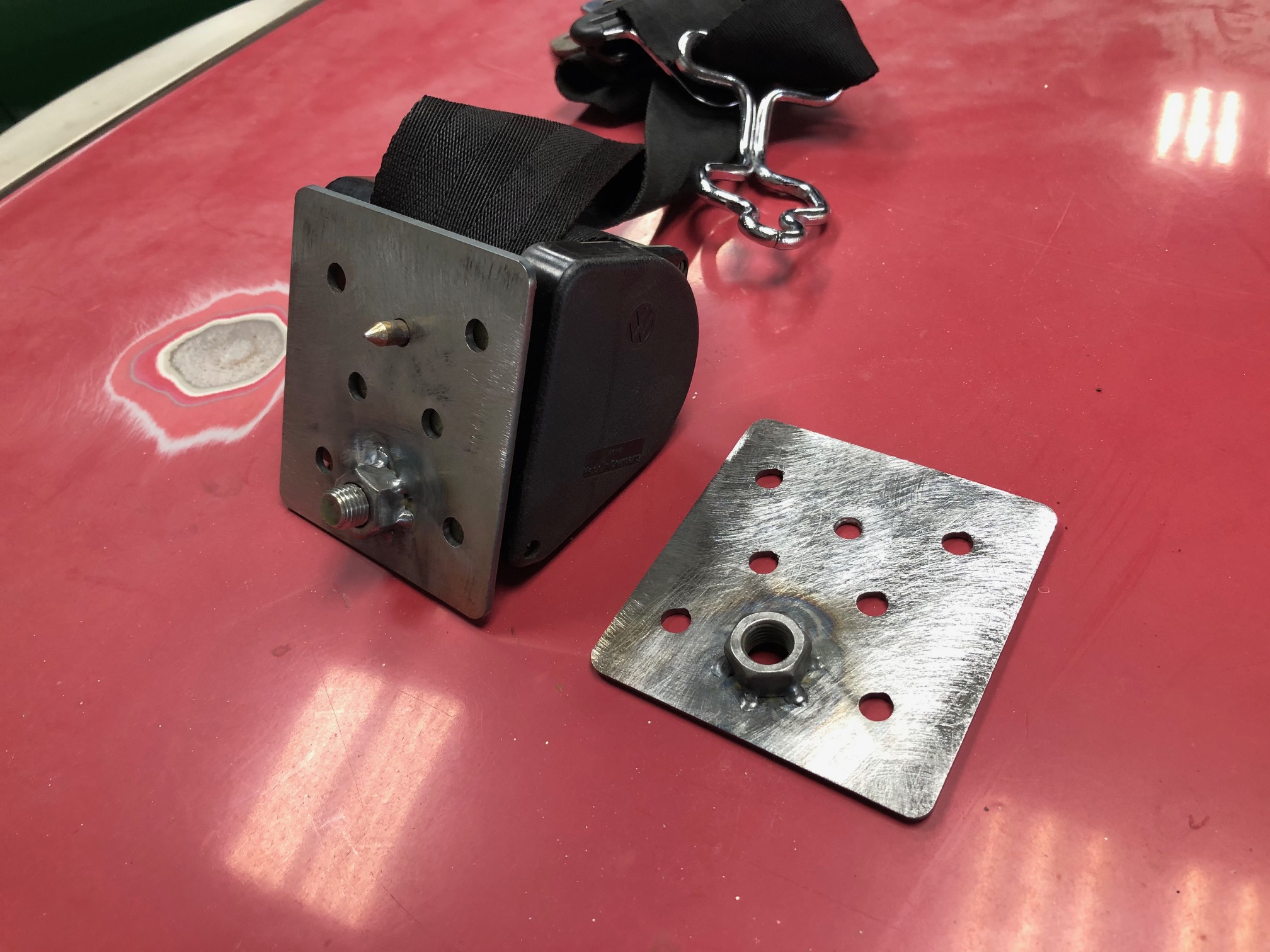 As an early car, it has no accommodation in the upper, outer corner of the fire wall for the seat belt retractors. Michael asked that I cut/replace that area with pieces from a later car. After looking at what that would require (remove rear window, drill spot welds, send sparks flying) and how close the needed welding is to the already completed (and insanely beautiful!) paint work and sail panel vinyl, I told Michael it wasn't a risk I'd be willing to take, above my pay-grade, etc. That led to a discussion of options and, given he'll likely never sell the car, and that it's already been modified in a number of other ways to make it just the way he wants it, he approved mounting the retractors at the base of the fire wall, same-ish way I did it in my LS car. So, here're the doubler plates I'll be welding to the already stiffened lower fire wall, complete with proper 7/16 -20 hardware in place and plug weld holes ready to go. Next step is to SAND SOME OF THE PERFECT PAINT OFF PART OF THIS CAR (IMG:style_emoticons/default/blink.gif) and get to welding. (IMG:style_emoticons/default/huh.gif) Attached thumbnail(s) |