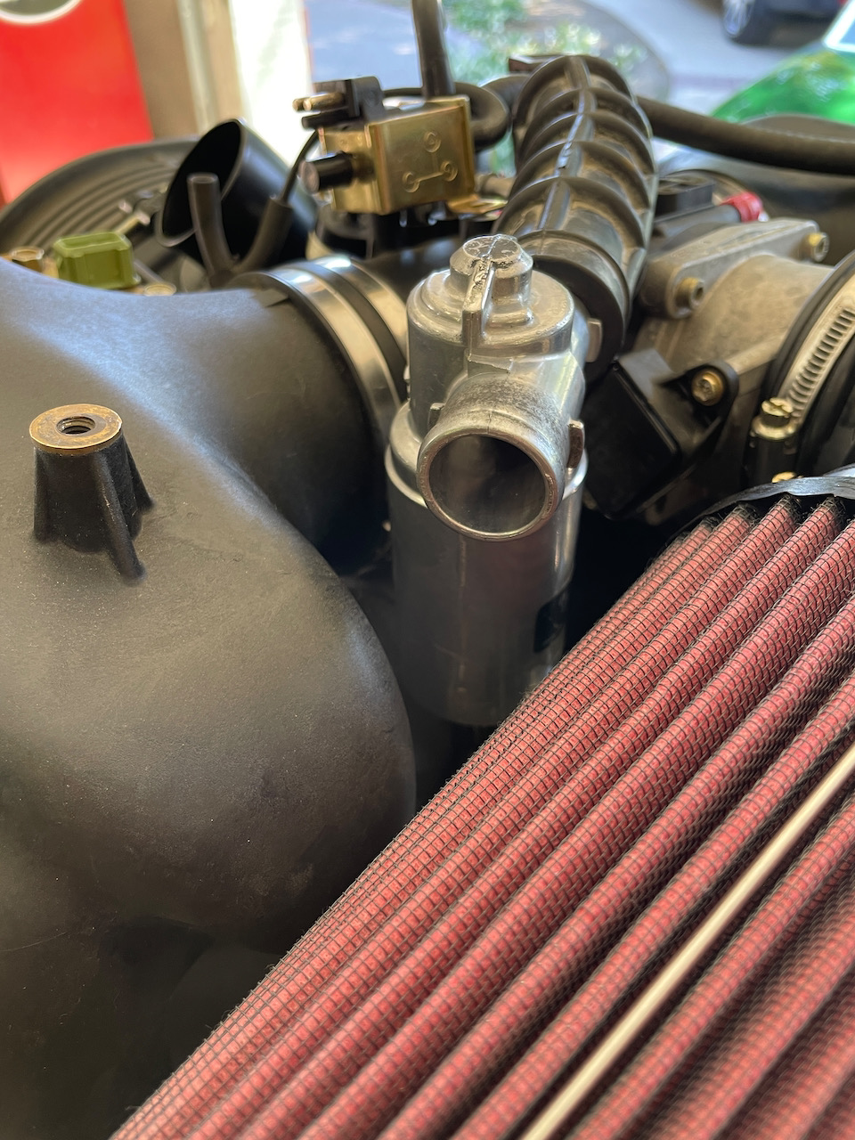 Then we installed the last piece of engine tin, the front (Fan) side- that completes the engine tins and I have to say they look great; Greg does nice work. Then we began futzing around with the idle control valve that in its stock position sits right on top of the motor and looks like crap. So we are exploring relocating it under the intake or at the very least to the non-throttle side of the throttle body so it is not right in your face. We are going to source to 7/8" OD pipe and see if we can make a pipe that will allow us to move it. It pulls vacuum so a normal rubber hose would likely collapse. Anyway, that was it for the day. We just kind of enjoyed lunch and then sat in the shade, like old men, and talked. (IMG:style_emoticons/default/beerchug.gif) |
