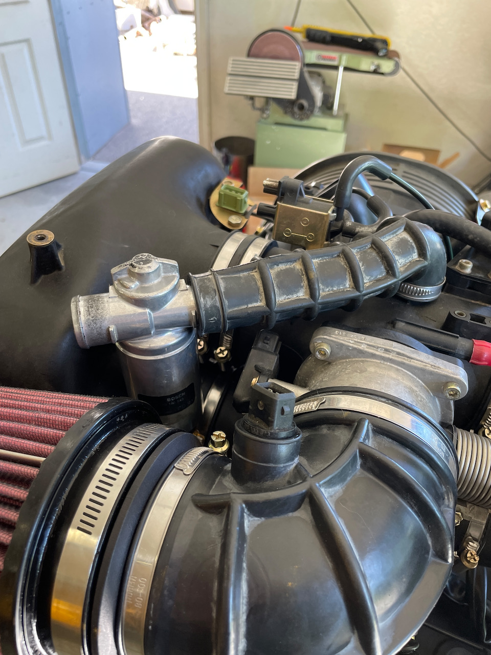 @ClayPerrine - Now that is a great question (IMG:style_emoticons/default/confused24.gif) . The PMS boot which replaces the stock 993 boot has ports for "things". I doubt those are for the MAF sensor. I googled '95 993 3.6 Porsche MAF sensor and I don't think anything like that came with the engine as received. I will have to look into this on Tuesday when Greg and I next meet to work on this. It isn't something that attaches to the ports for "things". The MAF sensor goes between the air cleaner and the throttle body. It has to be there for the engine to run. (IMG:http://www.914world.com/bbs2/uploads_offsite/cdn4.pelicanparts.com-1143-1715522456.1.jpg) The factory motronic won't work without it unless you do major modifications to it. |