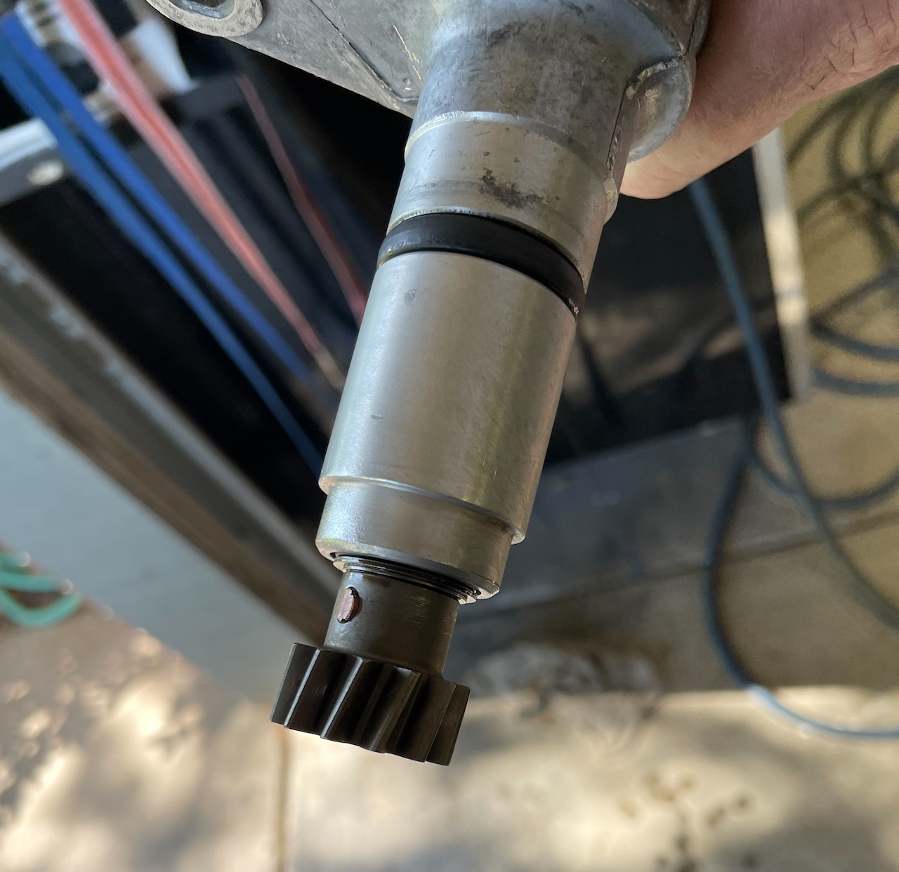 Today we put the distributor shaft gear pin in. You drive it in and it protrudes about 1/8" on either side. Greg used a punch and hit it to make the pin swell in the gear- that took about 1/8" of the excess off and then he ground the remainder. That puppy is not going to come out without drilling it out. We then put the new rotors on and installed the distributor after once again confirming both rotors are properly timed. Then we connected the coil wires and that was a wrap for the ignition.